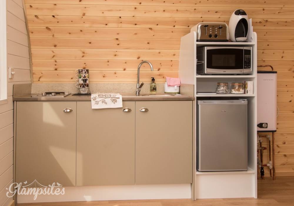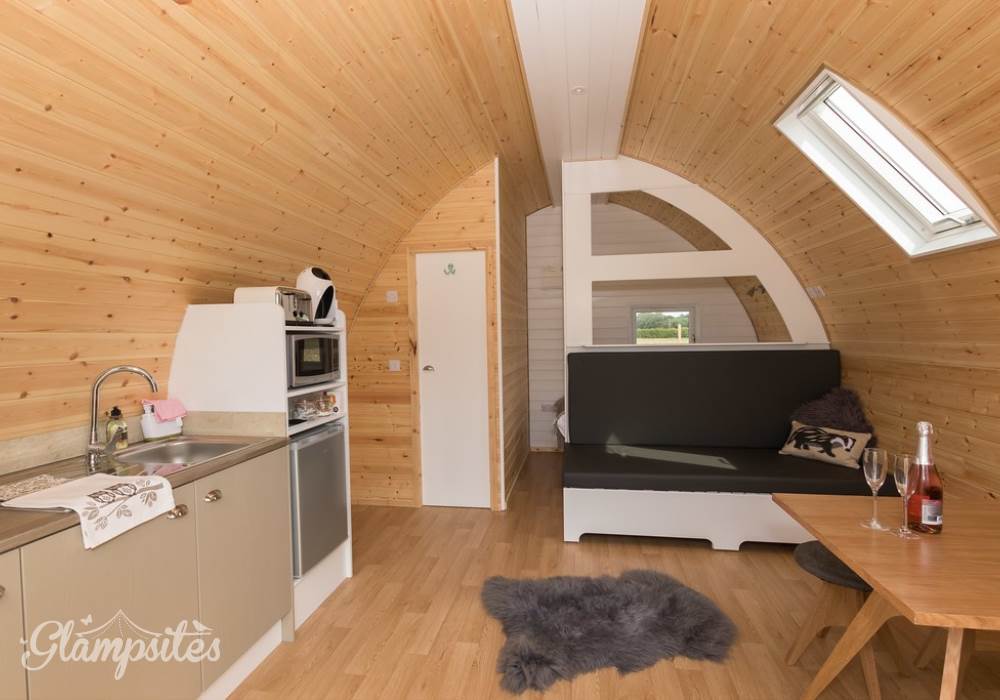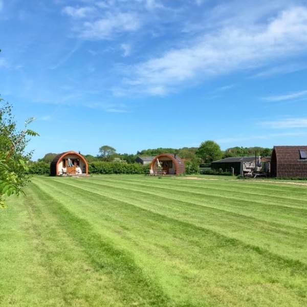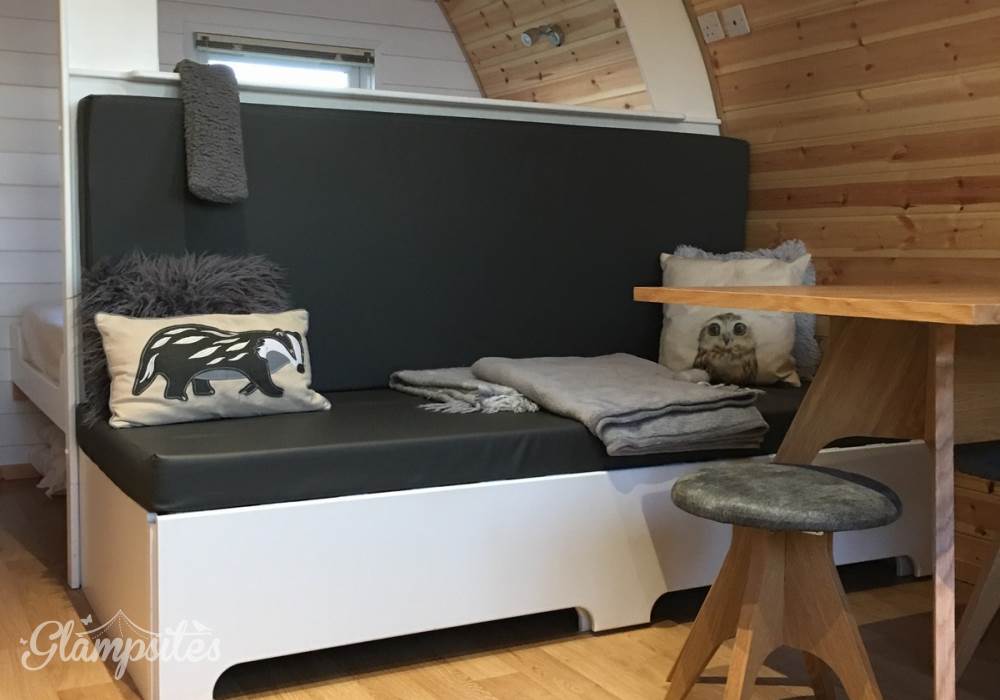 Your friendly hosts Nick and Lucy (and their five pups Alf, Digby, Rupert, Kit and Jinx) have conscientiously sourced their modern little pods locally and kitted them out in spectacular style with their own ensuite plus a kitchenette with a microwave, a fridge, a hob, a coffee machine and a kettle. Outside there’s also a private decked area with outdoor seating and a firepit for barbecue feasts (logs are available on site). Plus, you’ll be chuffed to hear that there’s no need to lug your bedding or towels along, because these are kindly supplied as standard. Muffin and Oso pods sleep 4, 2 in a full sized double and 2 in a large pullout sofa-bed, Tommy sleeps 2 in a full sized double