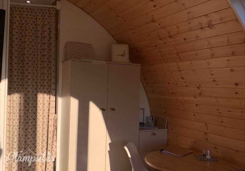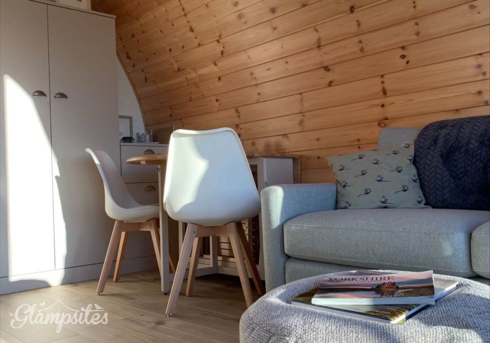 The living area includes a sofa (not a sofa bed), extendable dining table and chairs, smart TV, bluetooth speaker. WiFi is also available in the pod.