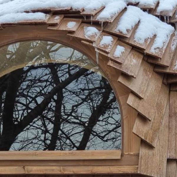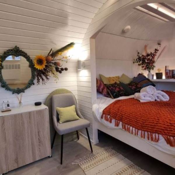 Orchard View – 'the iglu in the orchard'. Set in its own ¼ acre private orchard, with King size bed providing luxurious accommodation for a maximum of 2 adults. The cabin is fully insulated and heated, keeping you warm in the cooler evenings or winter months.