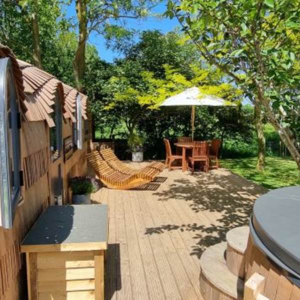 Orchard View includes a private log fired hot tub / plunge pool and a spacious log fired sauna cabin with changing area.