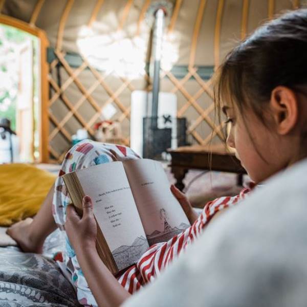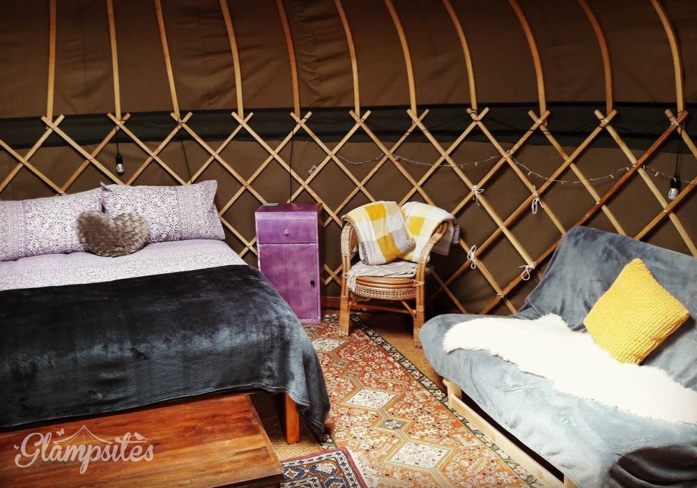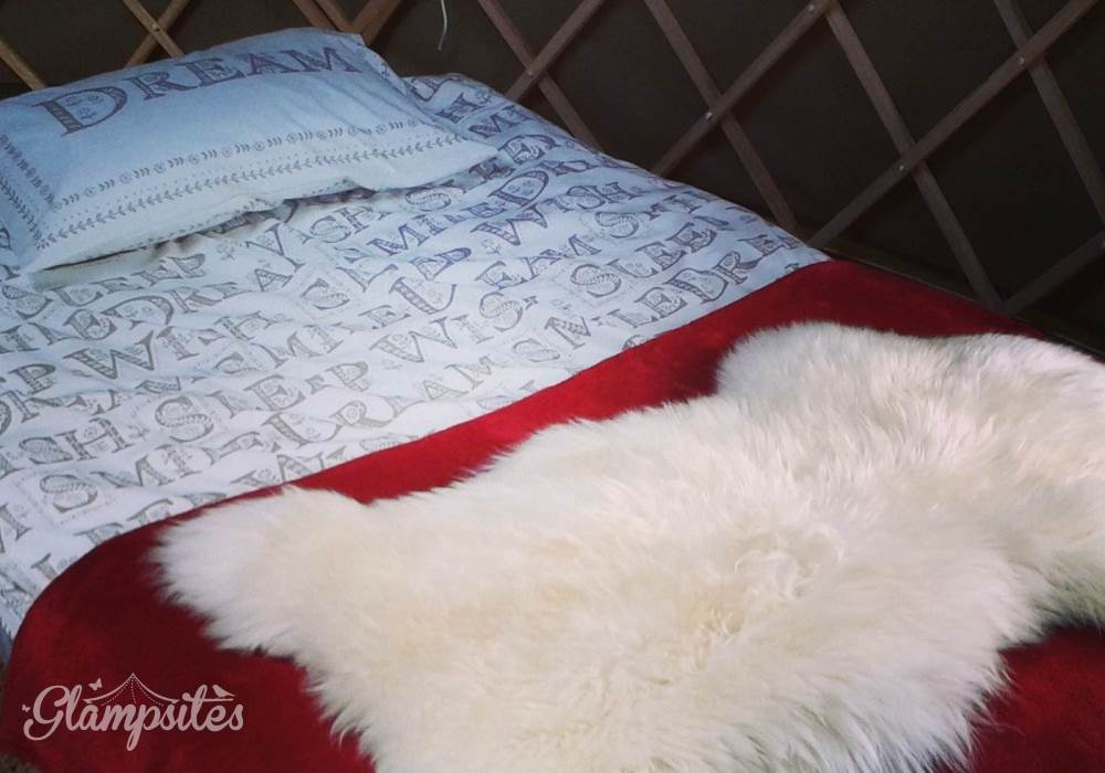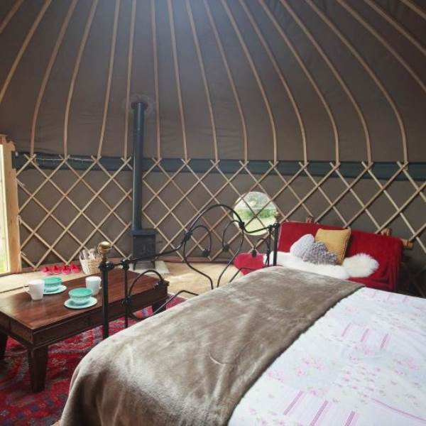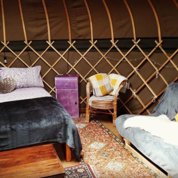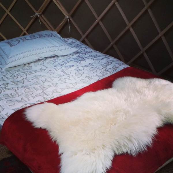 Buttercup can accommodate 5 people in a king bed, 1 double futon and 1 day bed (travel cots available). Bedding can be pre-booked (not towels) and a wood-burner, sheepskin rugs, blankets and throws will keep you snug and warm. Solar power lights and fairy lights add to the cosy atmosphere in the evenings and the circular crown floods the yurt with light by day.