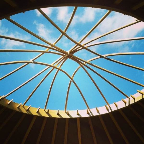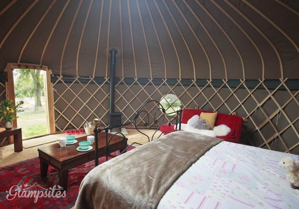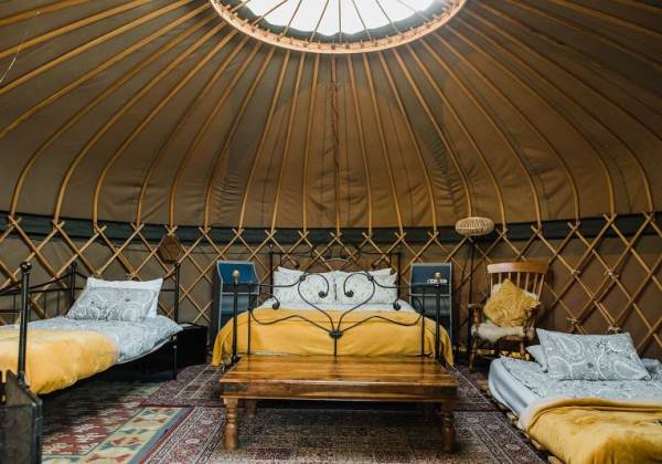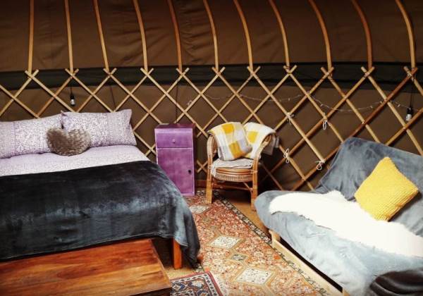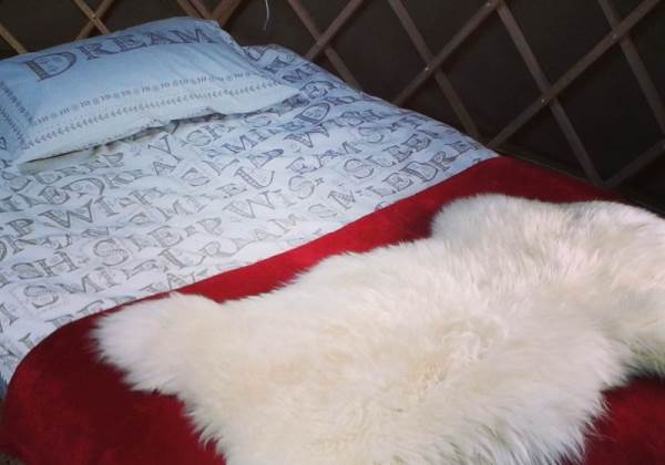 Campden Yurts is in Chipping Campden, North Gloucestershire, in the Cotswolds AONB (Area of Outstanding Natural Beauty). Daisy Yurt is spacious and comfortable and can accommodate 5 people in a king bed, 1 double futon, 1 single (travel cot available). Bedding can be pre-booked (not towels) and a wood-burner, sheepskin rugs, blankets and throws will keep you snug and warm. Solar power lights and fairy lights add to the cosy atmosphere in the evenings and the circular crown floods the yurt with light by day.