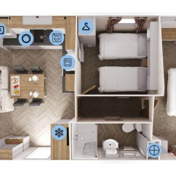 Our self-catering luxury lodges feature everything you need for a countryside break away, with a luxurious master bedroom boasting a walk-in wardrobe, en-suite with shower and dressing table with mirror. The twin Bedroom features bedside cabinets, plenty of storage space with the family bathroom opposite. In the spacious fully fitted kitchen area, you'll also find a dining table and 4 chairs. A spare foldup chair can be found in the cupboard next to the fridge. Also included with the fridge/freezer, is a 4 hob gas stove, oven, microwave, dishwasher, washing machine, iron and ironing board.