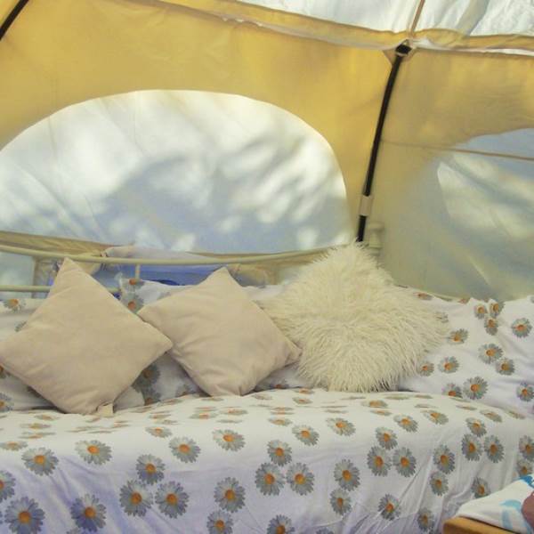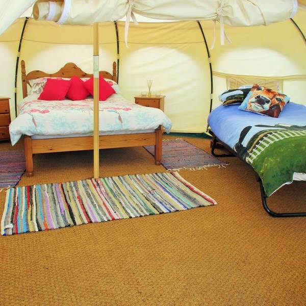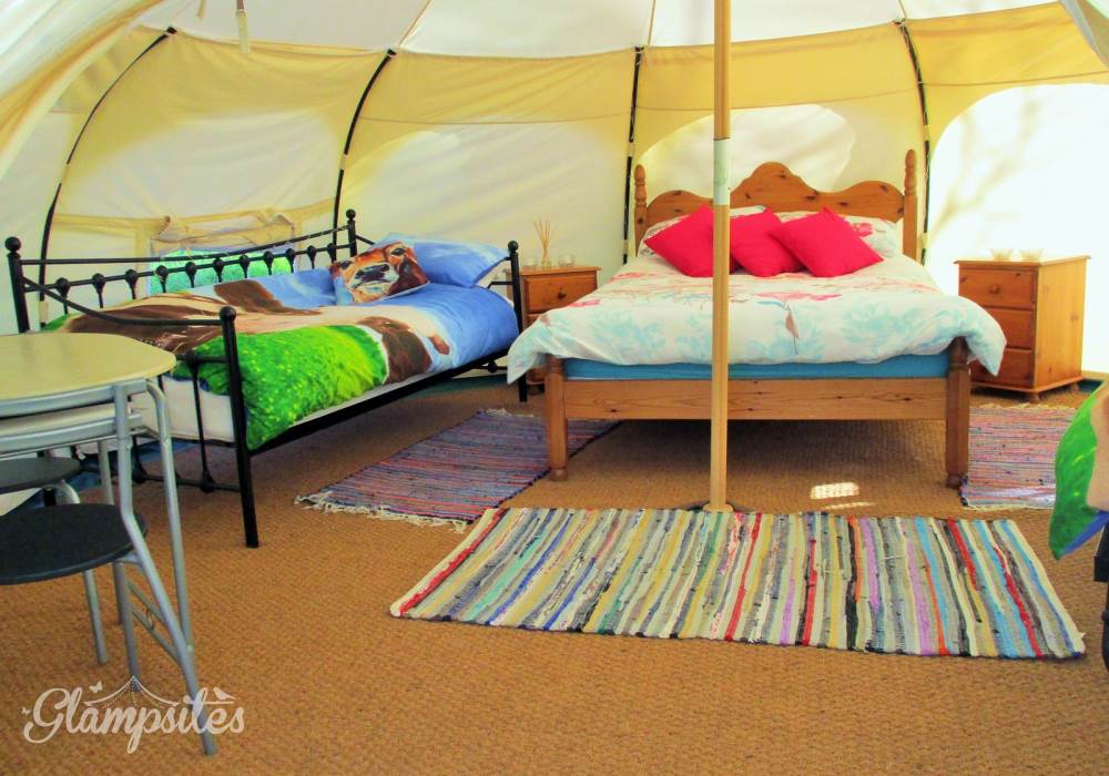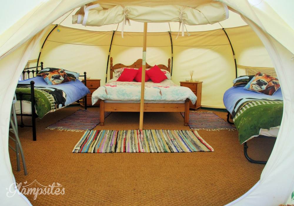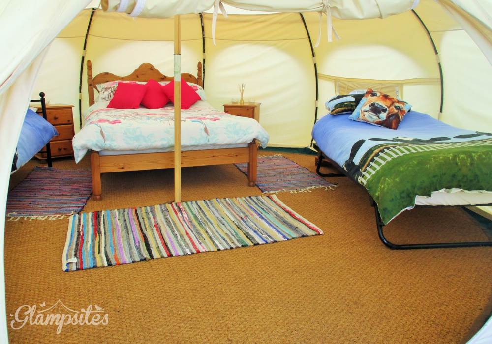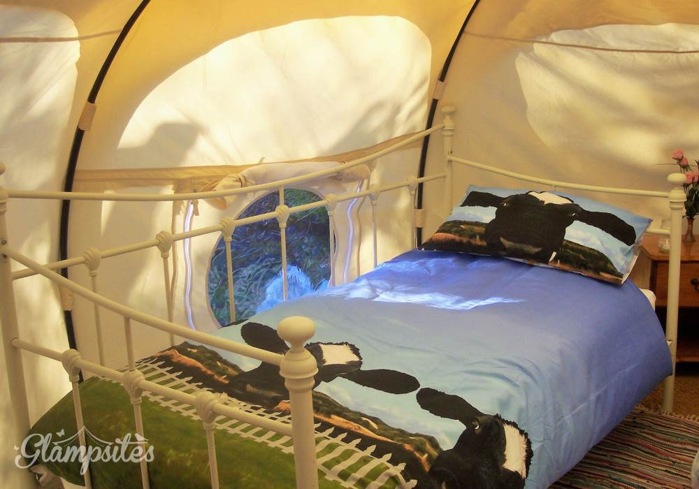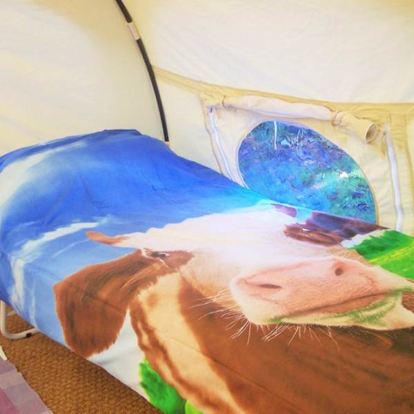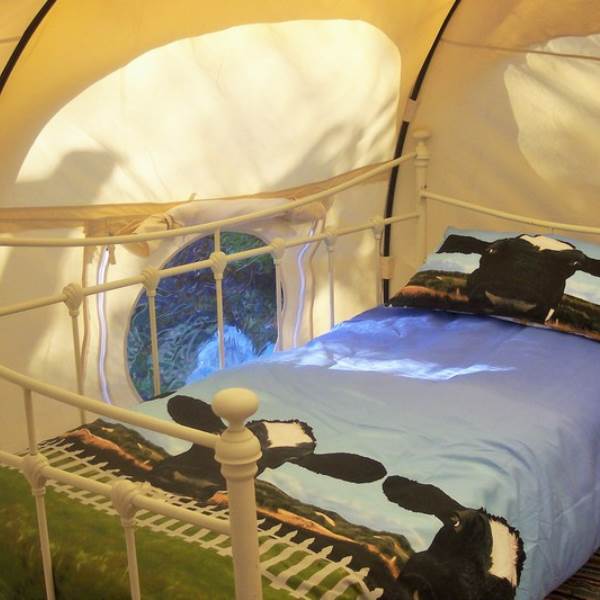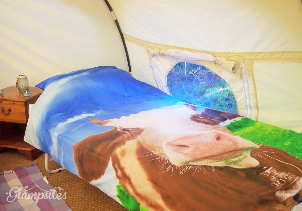 Each tent is furnished with proper beds and mattresses made up ready for your arrival. 4 people can sleep comfortably on a double bed, a single trundle bed and a day bed. A further small child can be accommodated in the travel cot provided or you can bring your own small blow up mattress. The cow themed duvet covers are a sure hit with children.