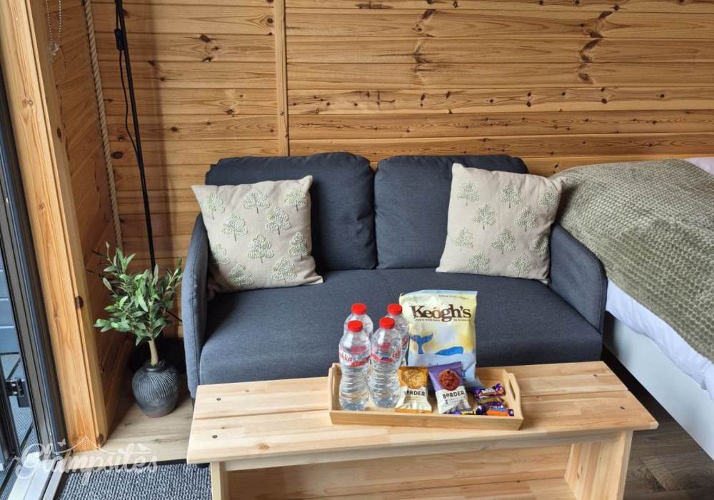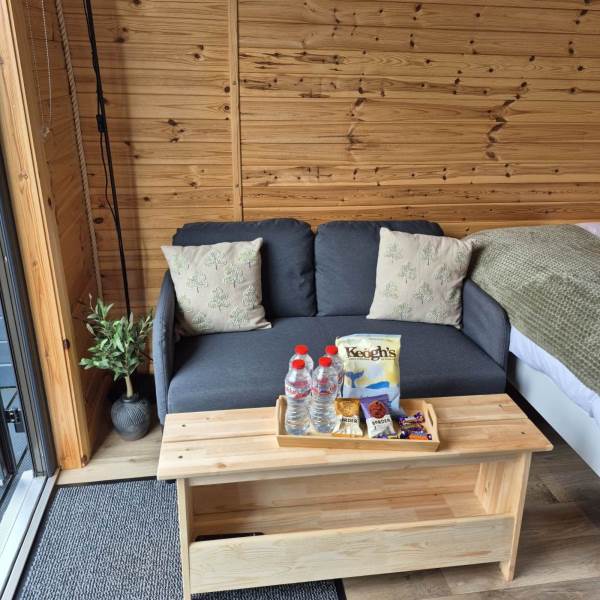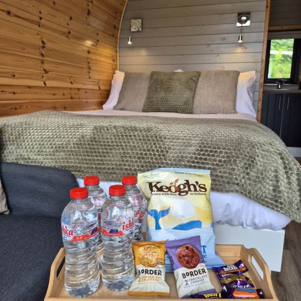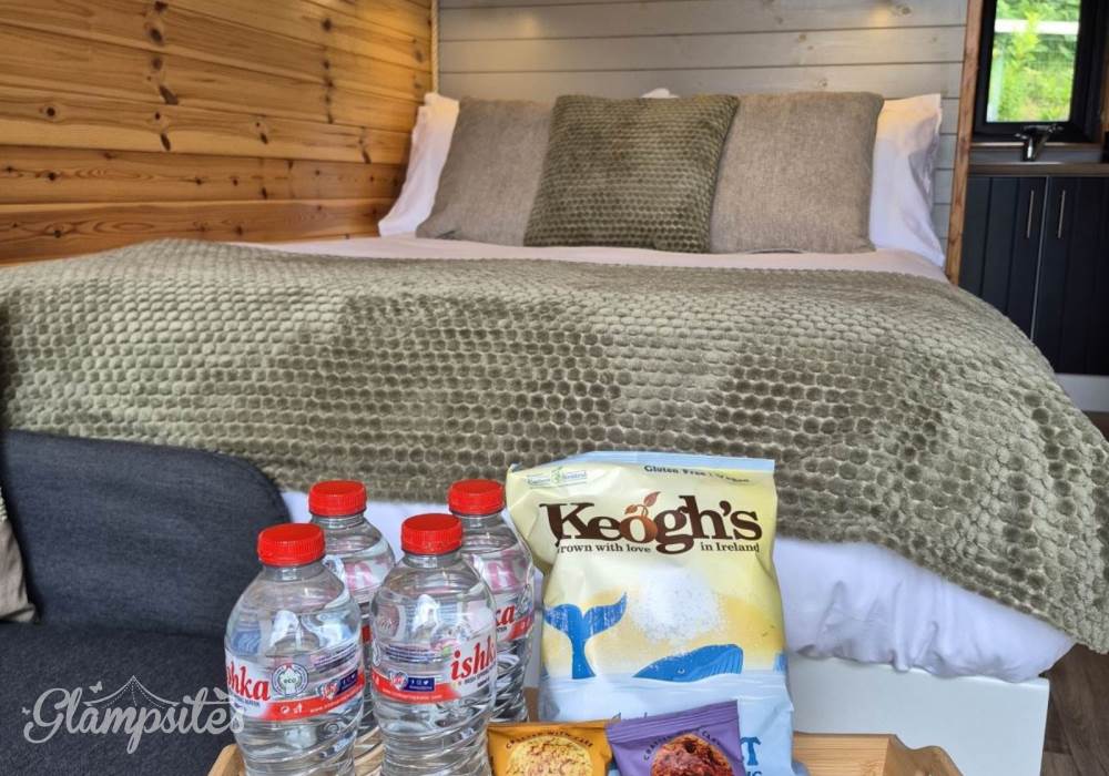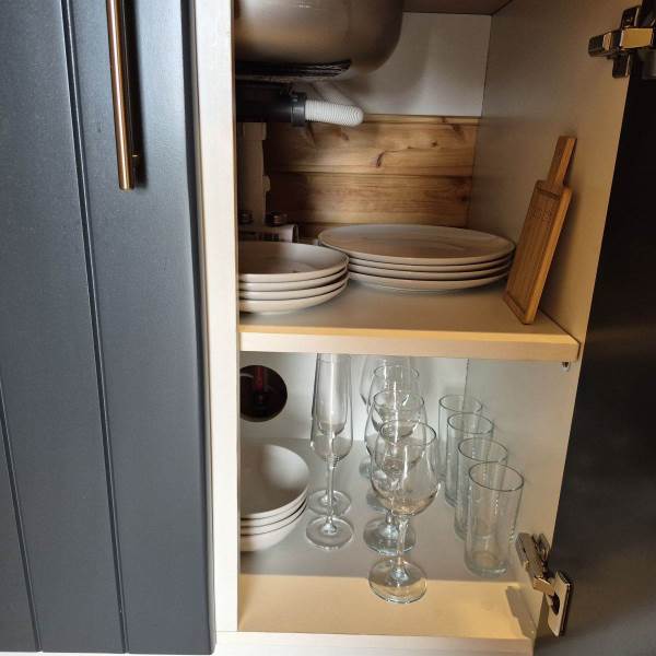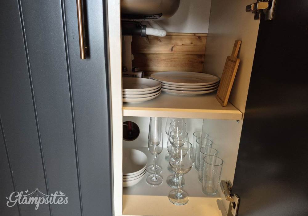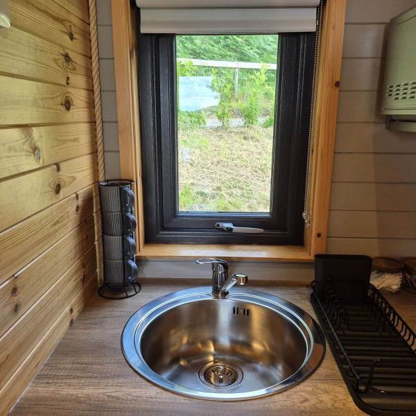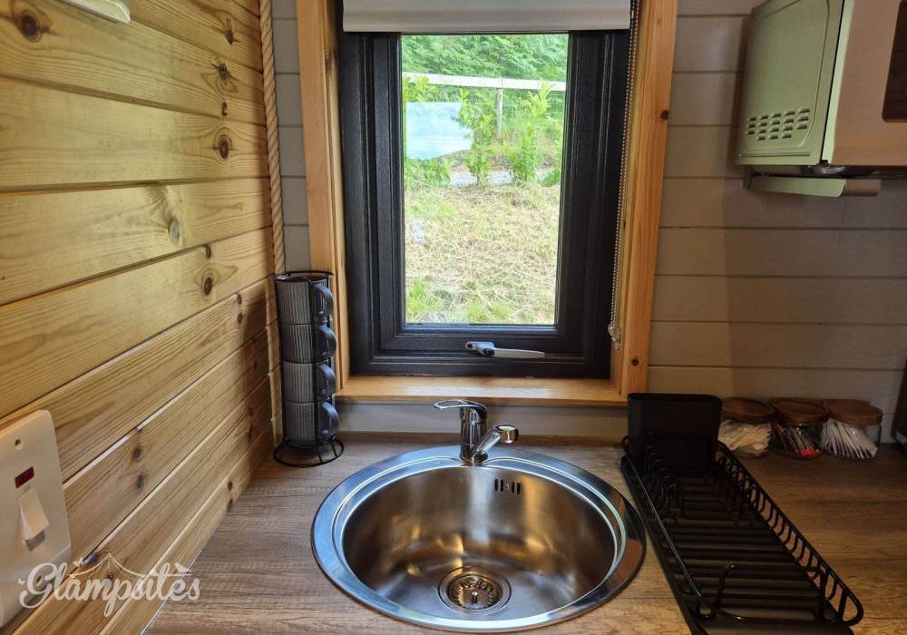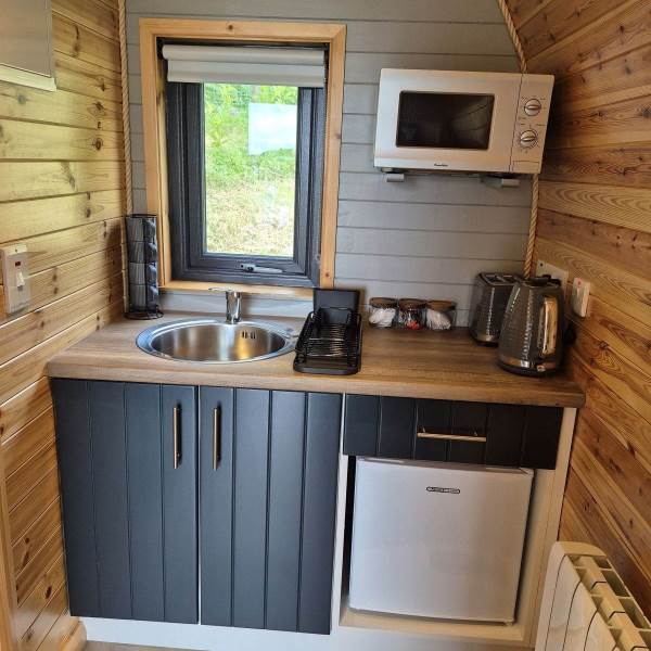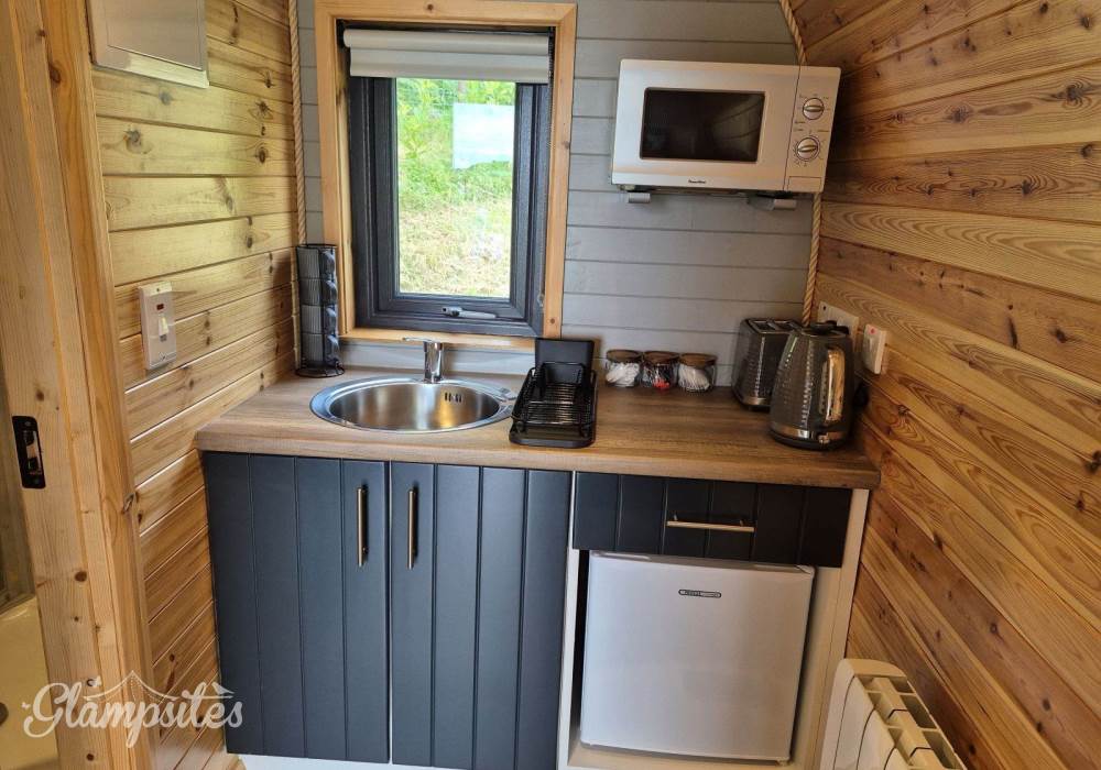 Small kitchenette with sink, fridge with ice box, kettle, toaster, microwave, plates, cups, glasses, cutlery, tea, coffee, sugar, milk