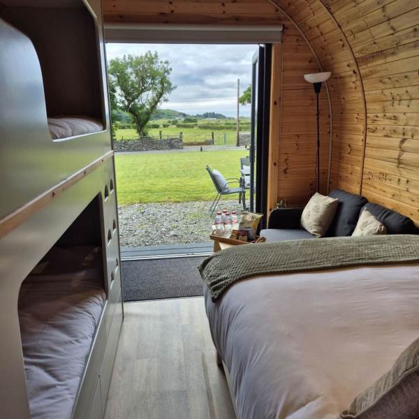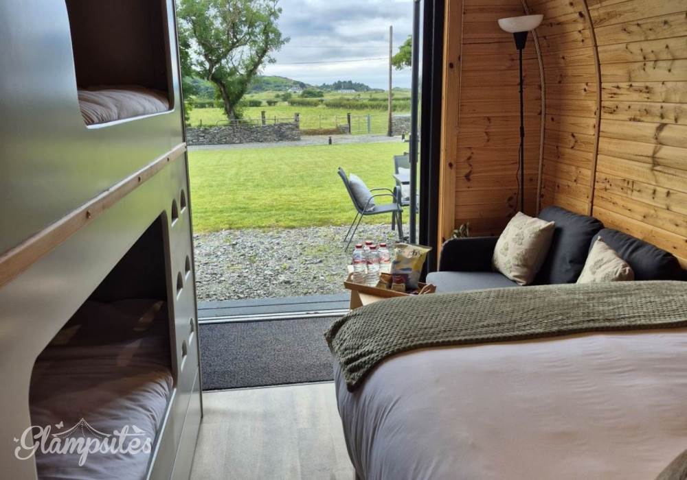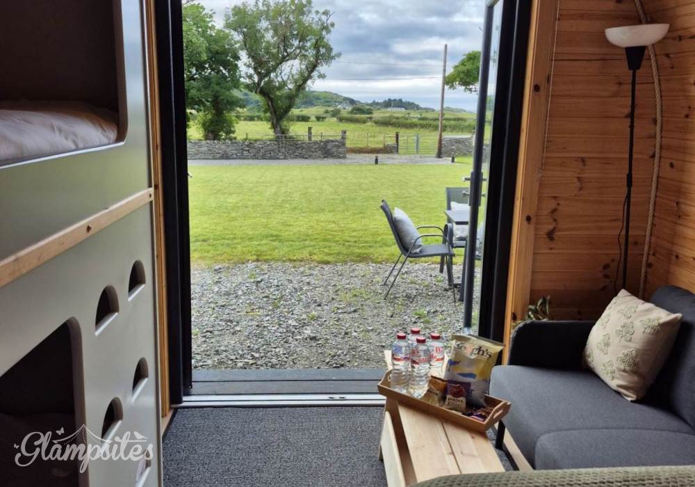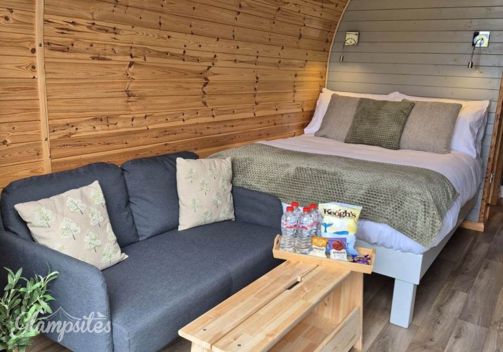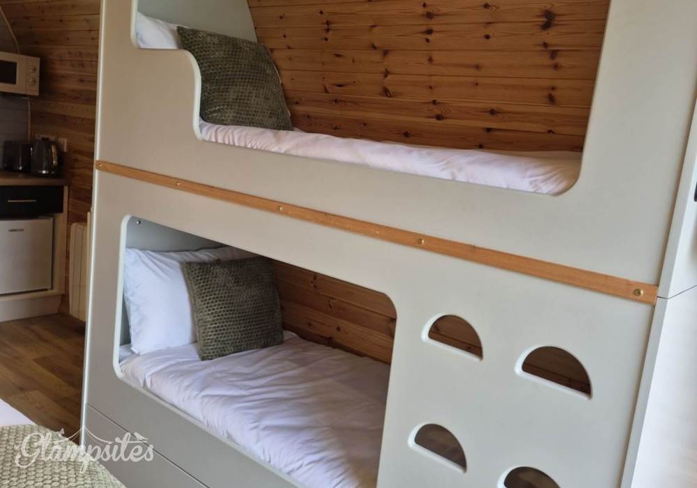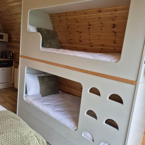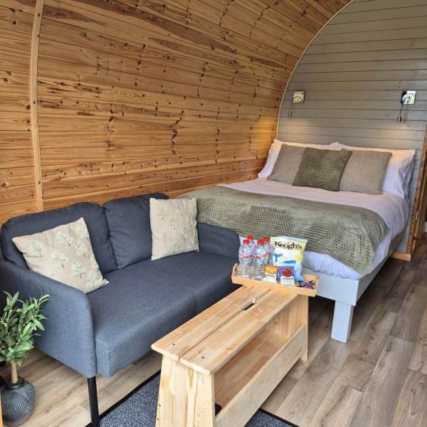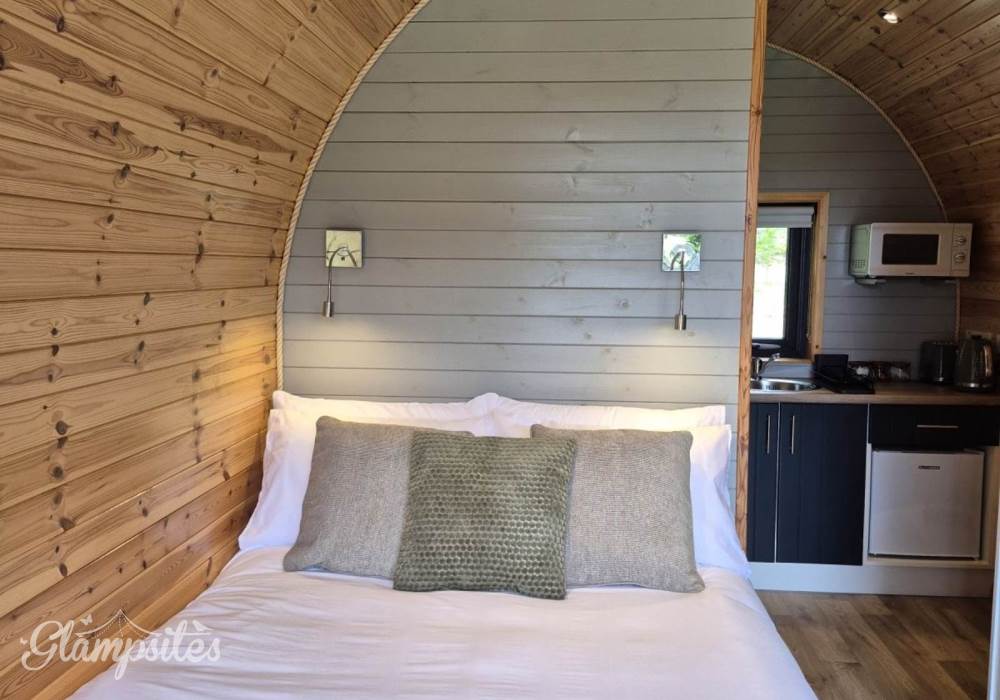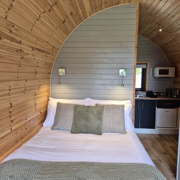 Small kitchenette with sink, fridge with ice box, kettle, toaster, microwave, plates, cups, glasses, cutlery, tea, coffee, sugar, milk