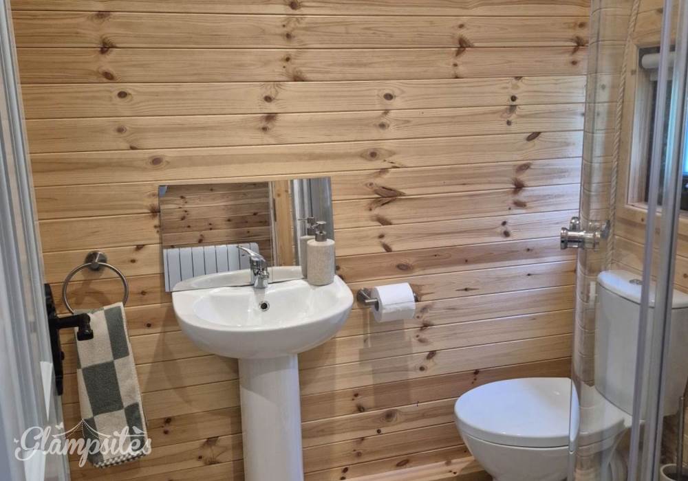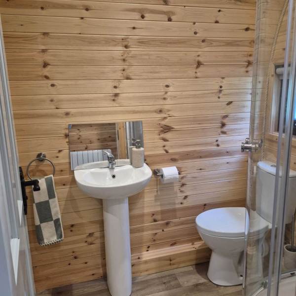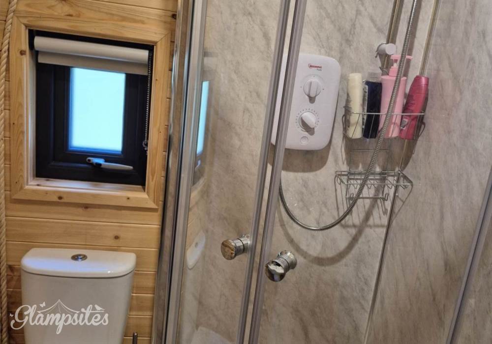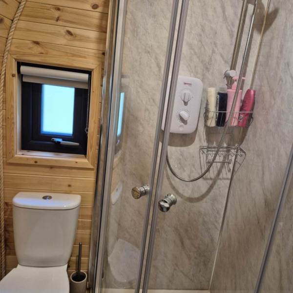 En-suite bathroom with toilet, shower, wash hand basin, toiletries, hand towel