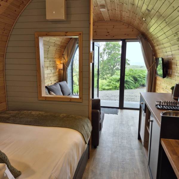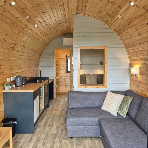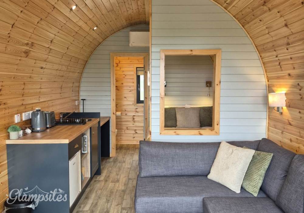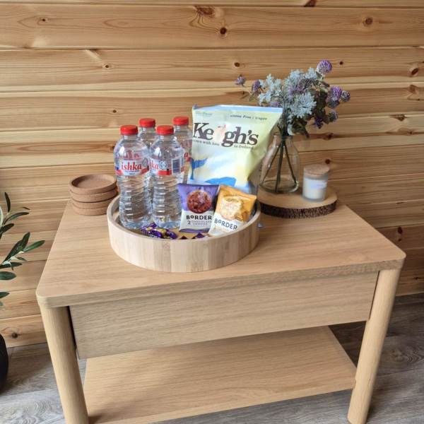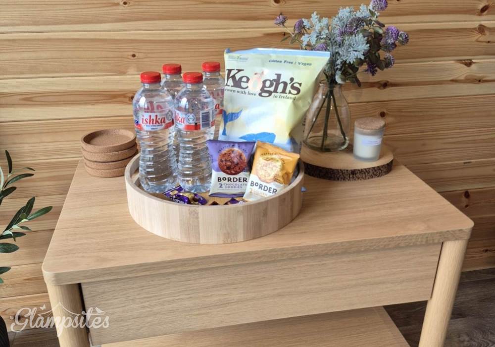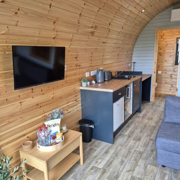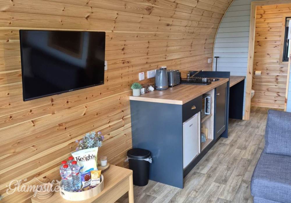 Small kitchenette with sink, fridge with ice box, kettle, toaster, microwave, cups, plates, glasses, cutlery, tea, coffee, sugar and milk