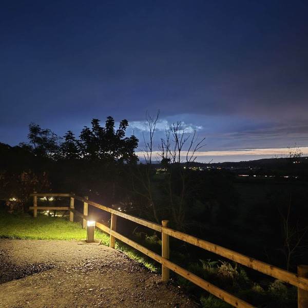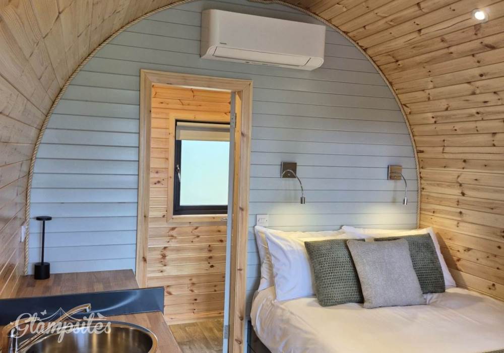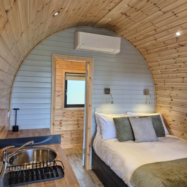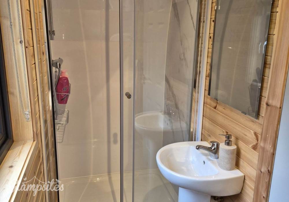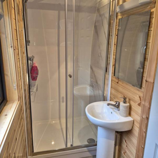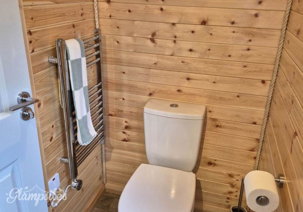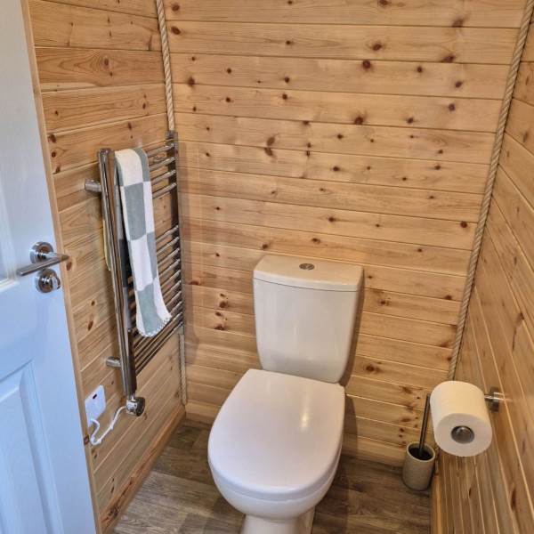 En-suite bathroom with toilet, shower, wash hand basin, heated towel rail, electric shaving plug, toiletries and hand towel