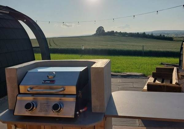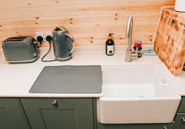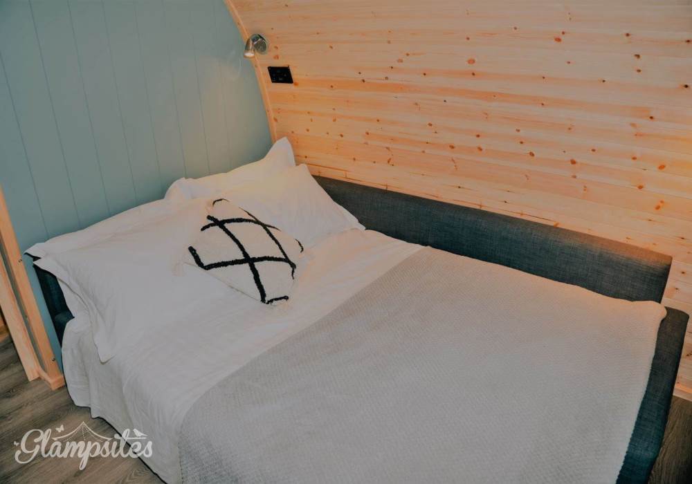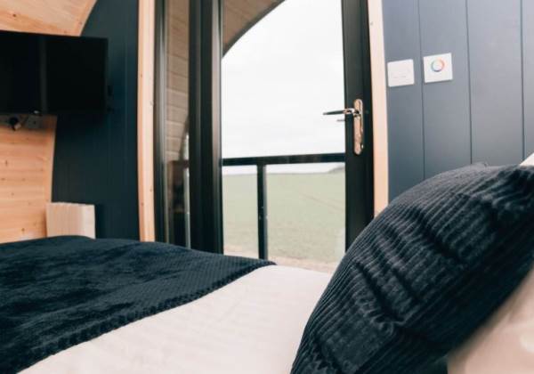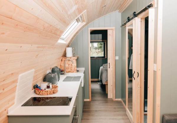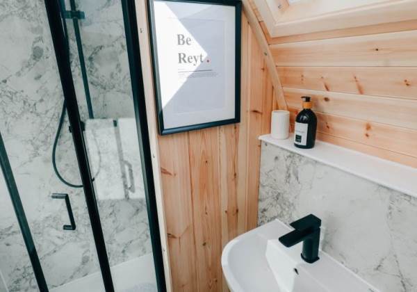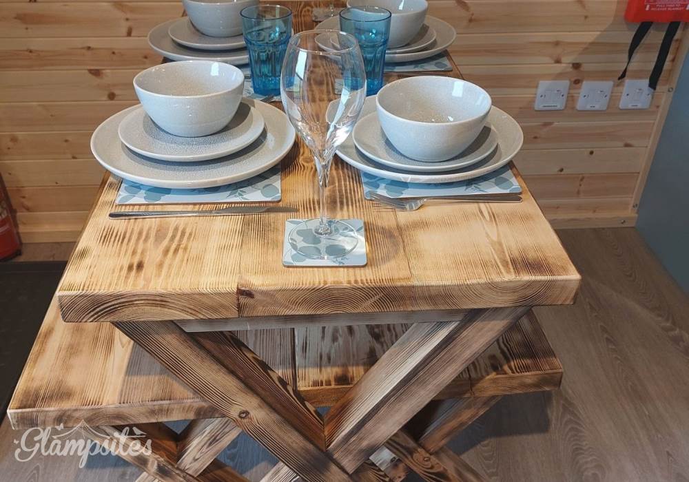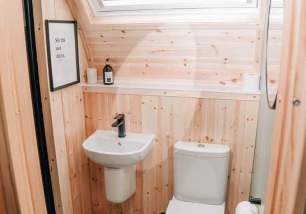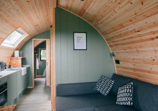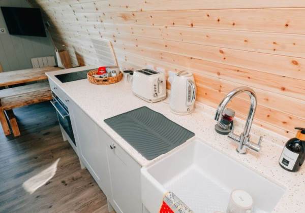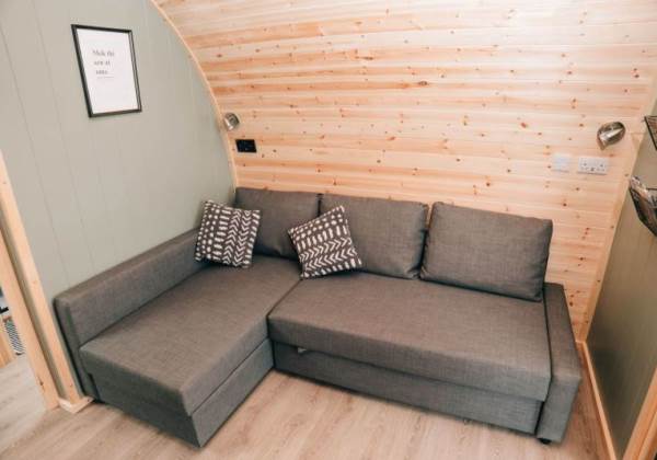 A fully-equipped kitchen awaits you in this pod and includes a microwave combi oven, fridge freezer, toaster, kettle, dishwasher and induction hob. Table and benches provide a space for guests to relax and enjoy their mealtimes. Electric and USB charging sockets are on hand for the convenience of our guests, enabling them to charge their devices.