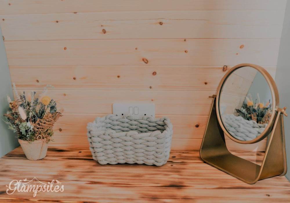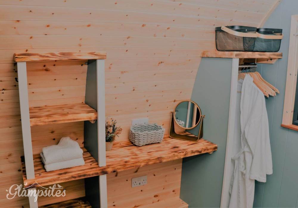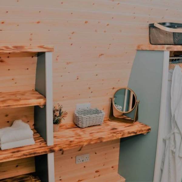 Our bespoke Cowslip Pod includes a king-sized bed in a separate bedroom area with its own dressing table, wardrobe, and shelves for extra storage space. A pull-out sofa bed is also provided with bedding stowed away (when booked for more than 2). All bed linen and towels are provided for your stay.
