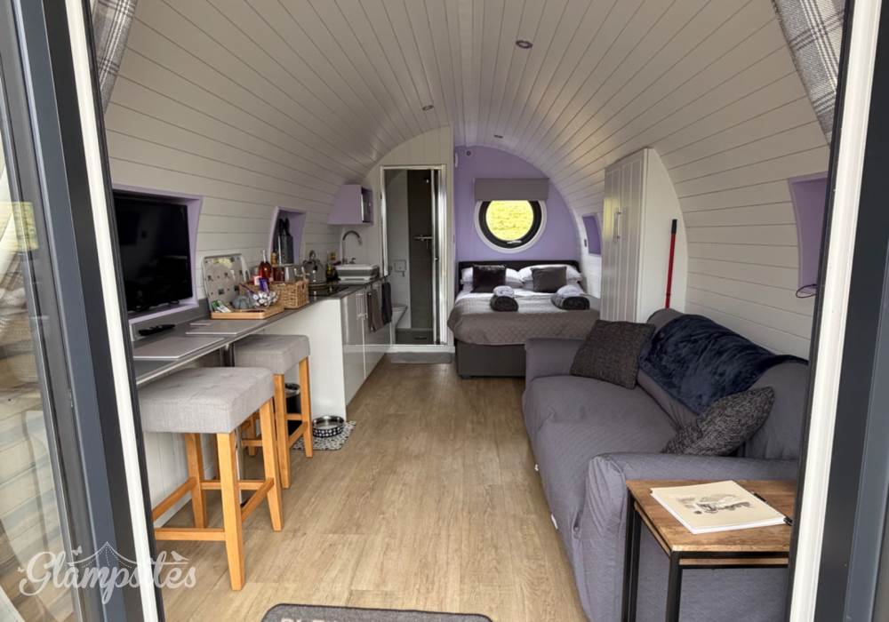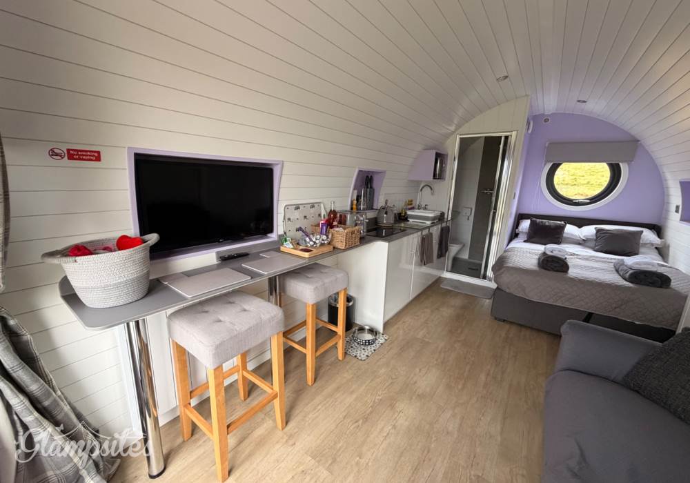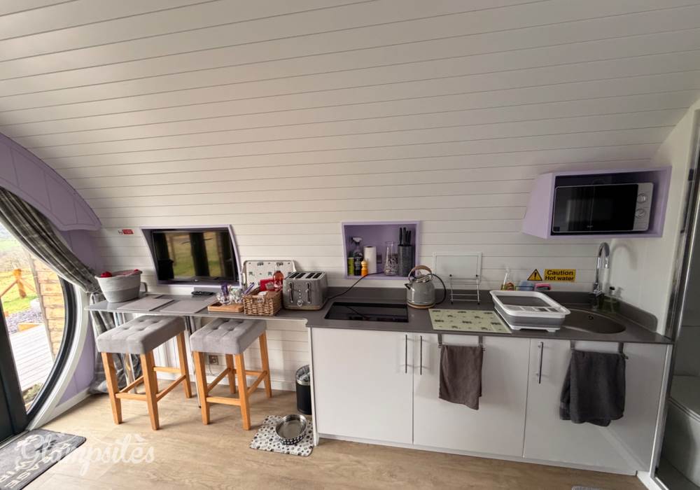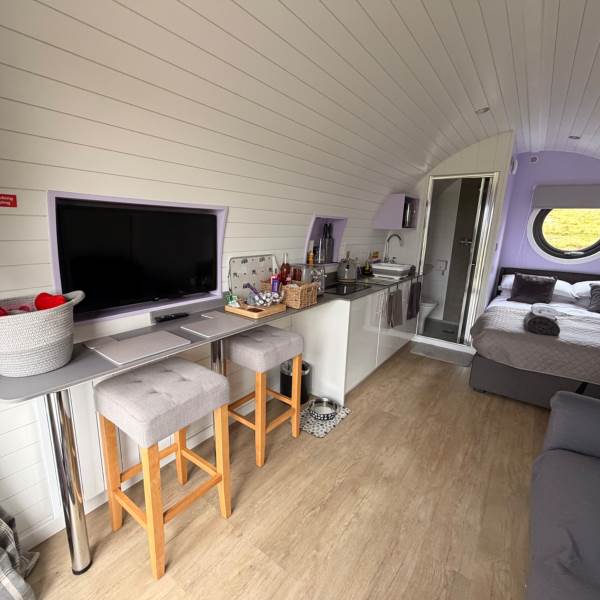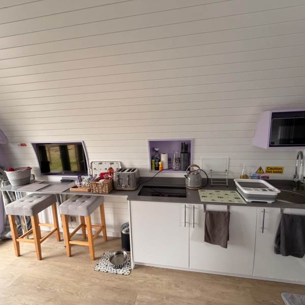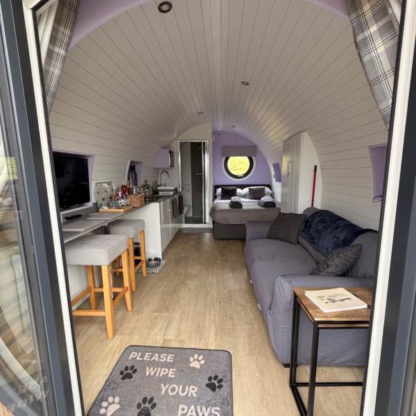 A completely dog friendly property for relaxing getaways, where you don't need to leave your best friends behind! With stunning mountain and field views all around, you can relax in the hot tub or next to the fire pit and watch the sun go down, all while your dog stretches out on the decking or does zooms round the garden. With a fully equipped kitchen, including induction hob, microwave, fridge and welcome basket, a double bed, comfy sofa, smart tv and free wifi included, you have all you need for a realxing stay. Your dog(s) will be made to feel as welcome as you (if not more)! There is a welcome basket for them on arrival, a water bowl, sofa and bed covers so they can snuggle up, and even a doggy playground next to the car park! After a busy day exploring, come back and snuggle up for a cosy movie night, or see the amazing starry sky from the hot tub or fire pit.