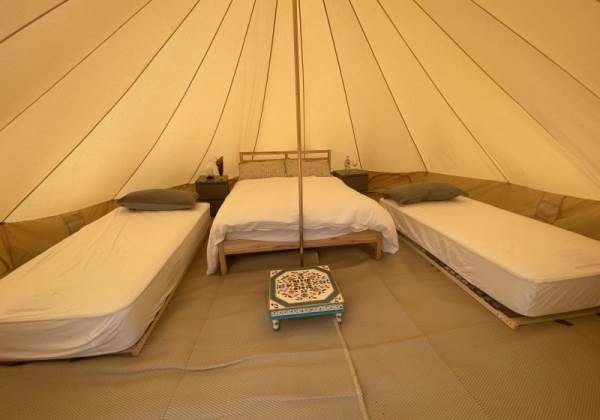 Nights under canvas in our new 5m Bell Tent big enough for a family of 4 or just a couple on a romantic break. You'll be able to hear the sea as you drift off to sleep. Furnished with a double bed and two singles, Irish-made 4-star hotel quality, Respa mattresses. Please bring sleeping bags for your children.