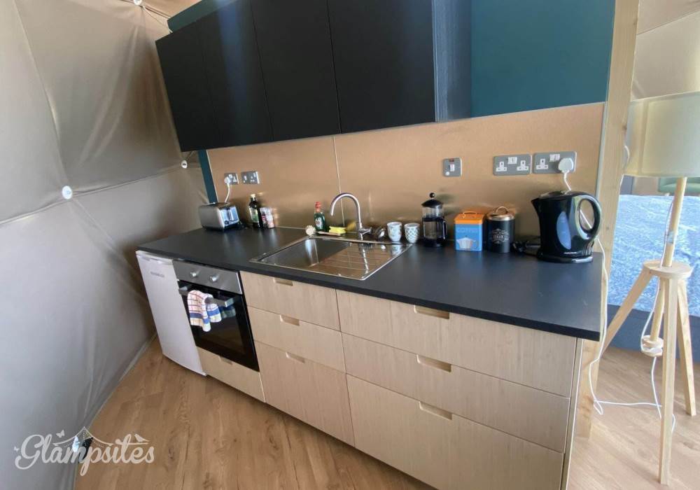 It sleeps four, with a skylight to view the stars, it is furnished with stylish, high-quality, Scandinavian-style furniture and a compact kitchen with an induction hob, and fridge. It has a shower and as it is within our Special Area of Conservation a dry toilet. The campsite toilets and shower are about 100m away.