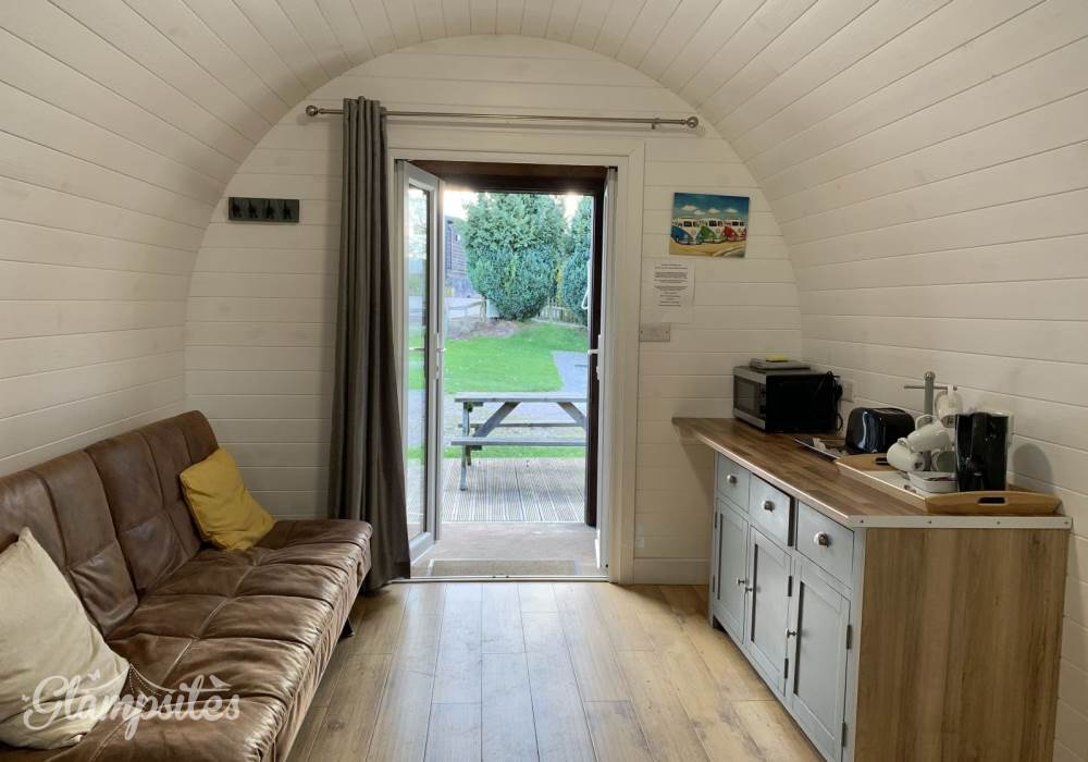 Our Luxury Greenway Farm Glamping Arks offer the ultimate in camping luxury - think "sleek hotel" more than standard glamping. Equipped with sofas, a dining table and chairs, a flat-screen TV, deep pile rugs and a sideboard fully equipped with toaster, kettle and all the utensils & crockery/cutlery you need.
