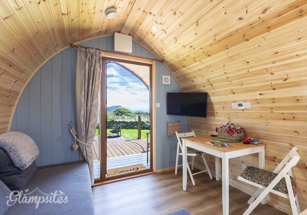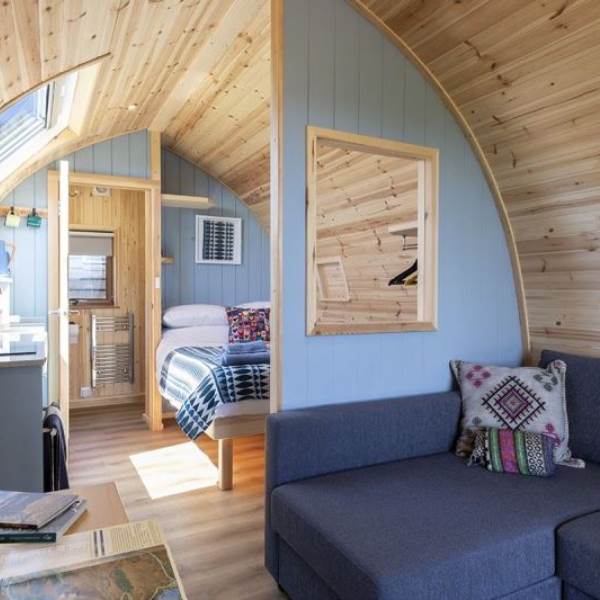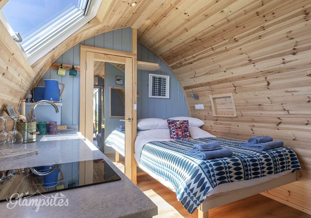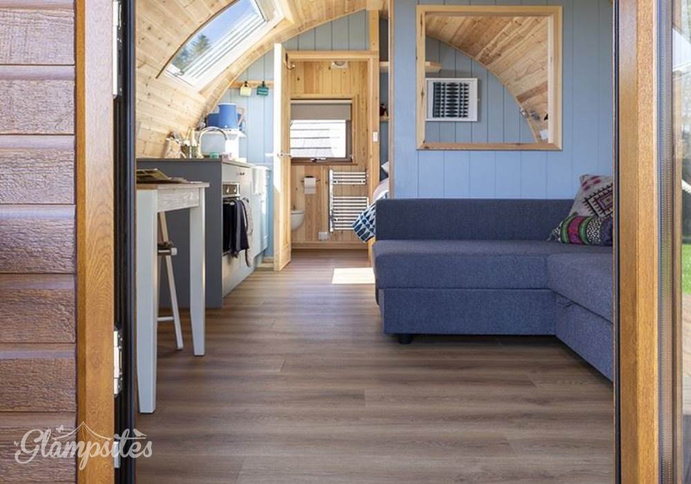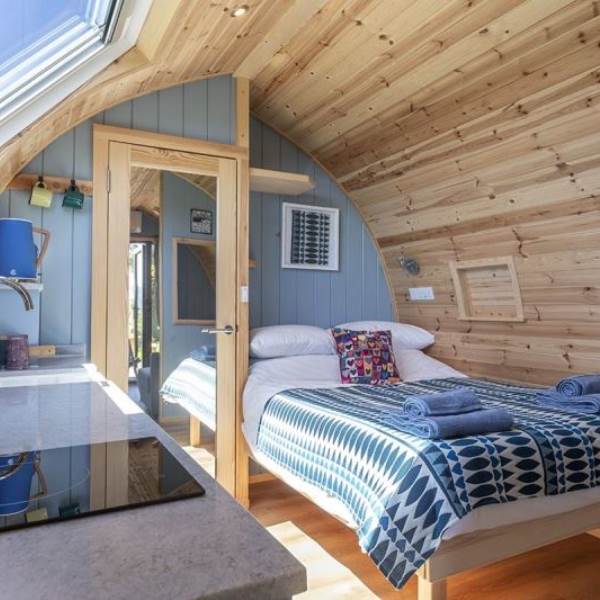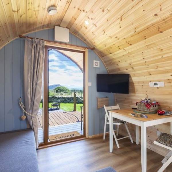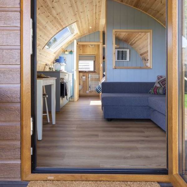 The pod offers the best of both worlds, the freedom of camping with the comfort of home. Private Hot Tub. This Pod offers its own en-suite shower room, well-equipped kitchenette, and a lounge area with sofa and Smart TV, this pod truly has everything. Underfloor heating will keep you warm all year round, and there is good WiFi. The decor reflects the countryside location, and the comfy double bed features duvets made locally from 100% pure Welsh BAAVET wool.