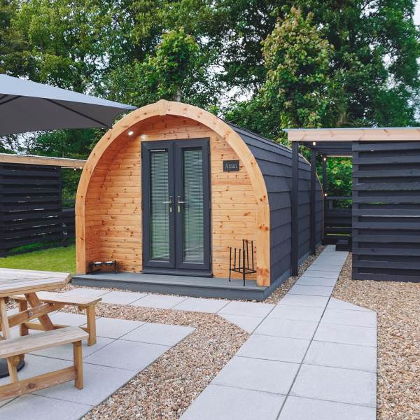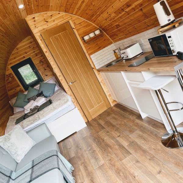 Our Arran pod offers an escape for nature lovers and their four-legged friends. Compact yet beautifully designed, the pod combines rustic simplicity with modern comforts—featuring a cosy double bed, heating, double sofa bed soft lighting, and a small kitchenette for easy self-catering.
