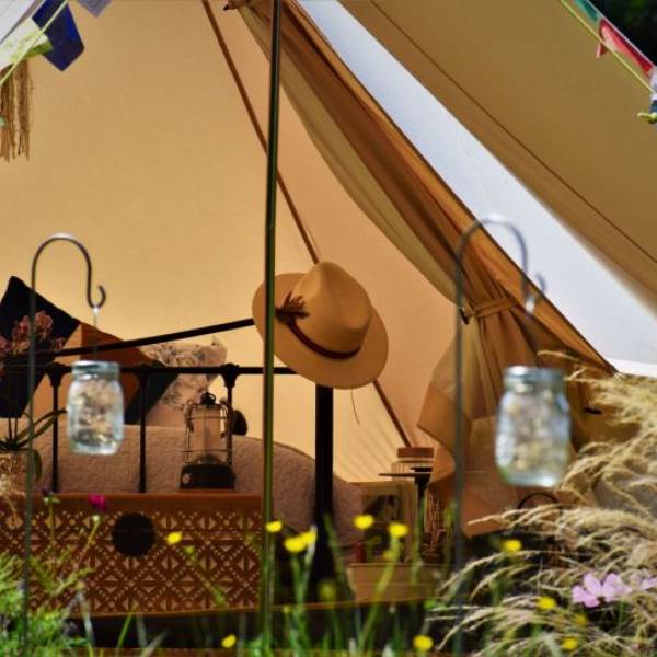 Perfect for a peaceful, couple’s retreat and a calm place to escape the busy world. Follow the woodland path up to your own private enclosure with the bell tent above the grass on wooden decking surrounded by a wild meadow with colourful flowers and sweet peas.