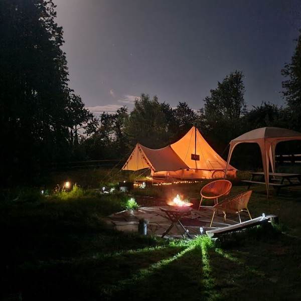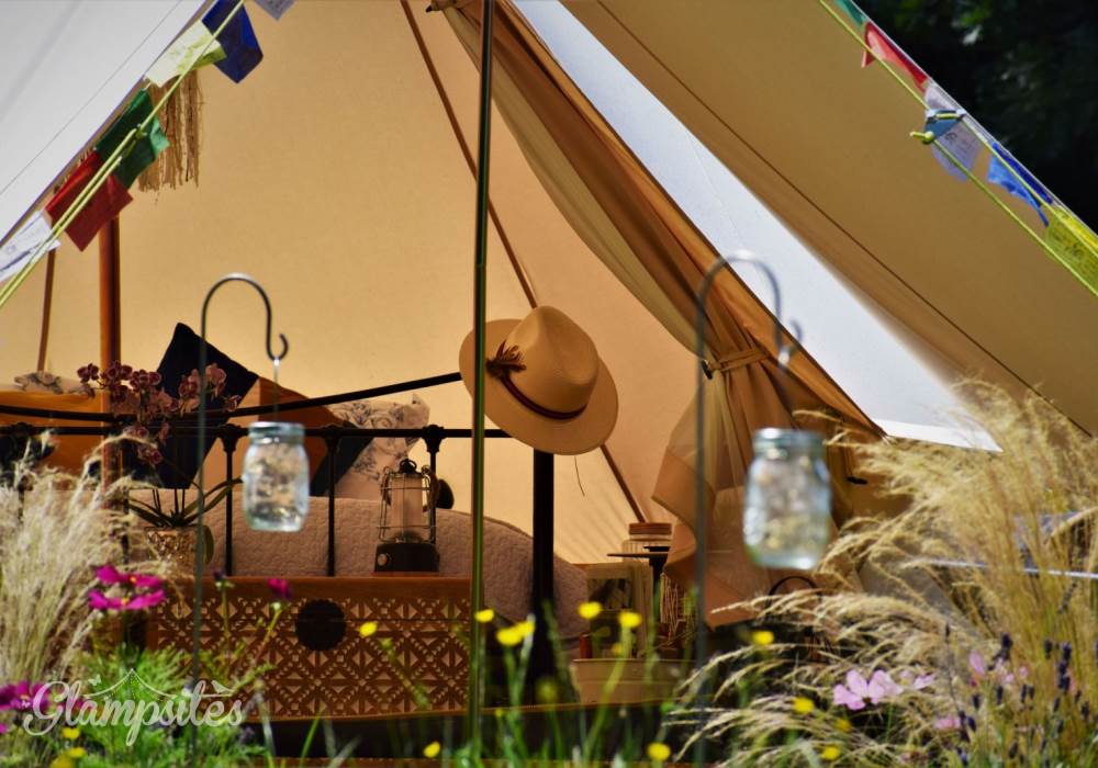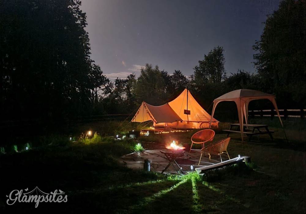Just One Bell Tent rests in a quiet corner of the old cherry and hop farm. Featured alongside Hoppickers Rural Retreats, a well established site with over 12 years’ experience in award winning self-catered accommodation. Surrounded by woodland with a view over the horse paddock, only a 15-minute drive to The Malverns. The winding path and colourful flowers will entice you into the fully furnished bell tent. A romantic retreat for couples. Dark skies for stargazing by the fire pit. A truly luxurious Glamping experience.