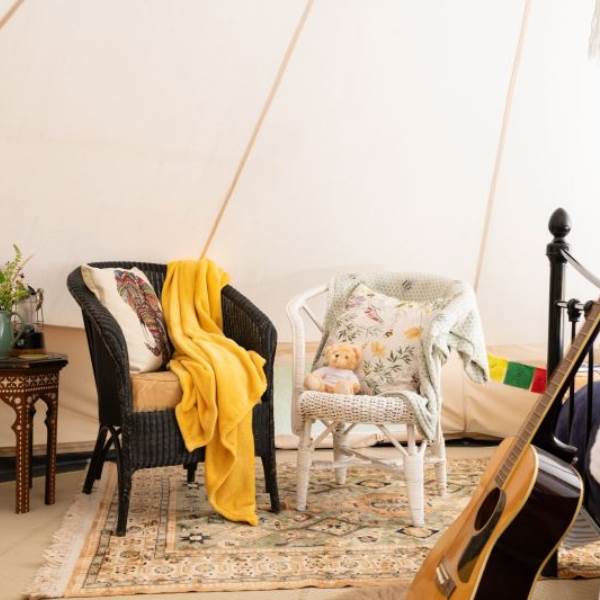 Within the bell tent you have a king size bed with quality linen and blankets. Silk rugs cover the floor with sheepskin rugs either side of the bed and wooden bedside tables with books. Lloyd loom chairs with decorative pillows and a small coffee table. You can light the log burner to keep cosy and hang your clothes on the rail. With plenty of storage in large wooden chests this is a luxuriously furnished bell tent.