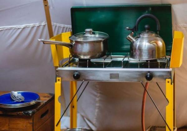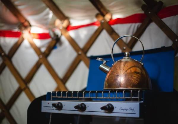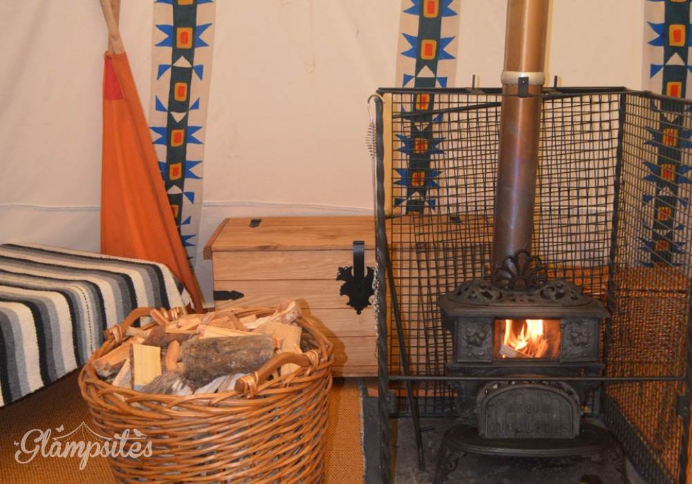 There is a chest full of extra blankets, a two ringed gas camping stove and all of your cooking equipment – pans, plates, kettle, mugs and cutlery. Lighting is provided and hanging lanterns help to create a warm and exceptionally cosy atmosphere. We also supply firelighters and a good supply of chopped, dry and seasoned hardwood in a basket.
