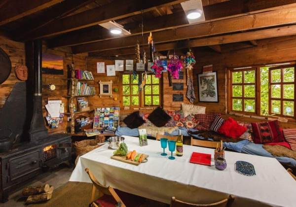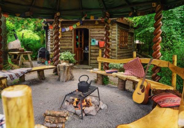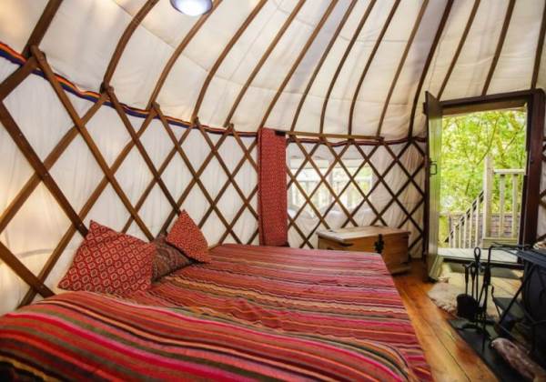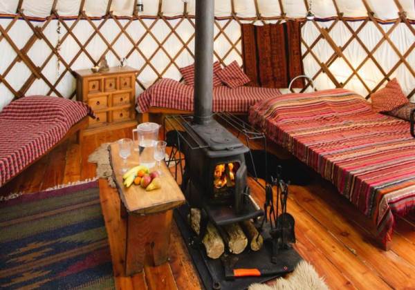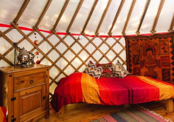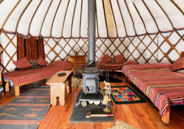 Decorated with Native American patterns, the Tipi is heated with a woodburning stove (with a fireguard). This accommodation sleeps four with one double and two single beds. Blankets with Native American designs create a lovely ambience and large cushions and bean bags are also provided for that extra comfort.