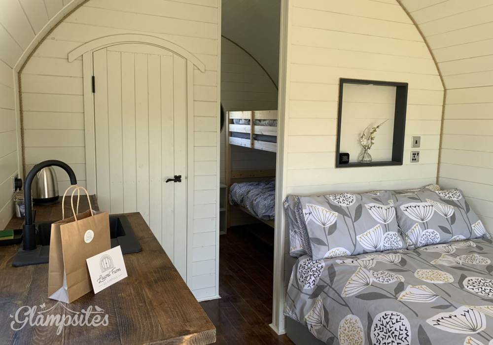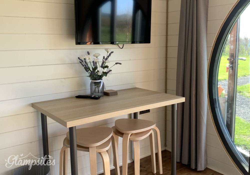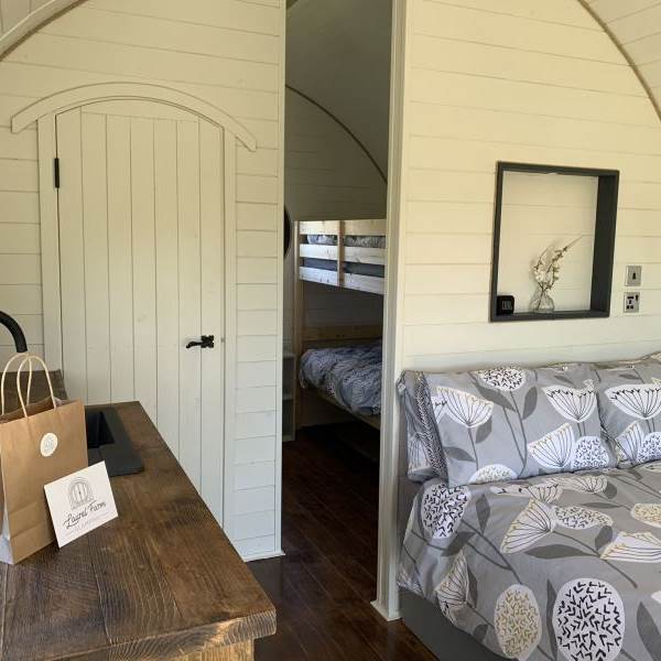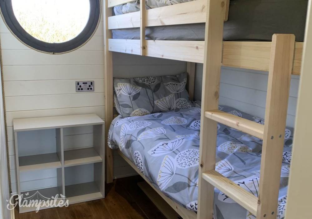 Our family pods, both identical, have a double bed, full length bunk beds, sofa and table with stools. Every pod has WiFi with smart TVs for guests to use personal accounts such as Netflix, Amazon Prime etc.