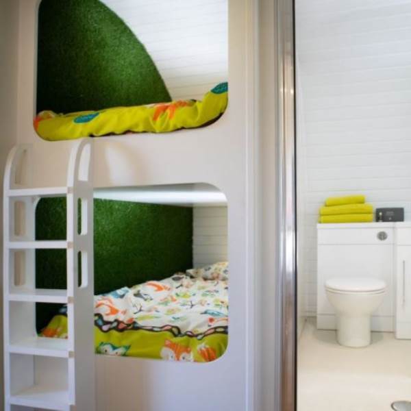 Queen caters for up to 6 people – 1 luxurious double bed, 1 comfy pull-out double-size sofa bed and 2 single cabin bunk beds, which the kids will adore!