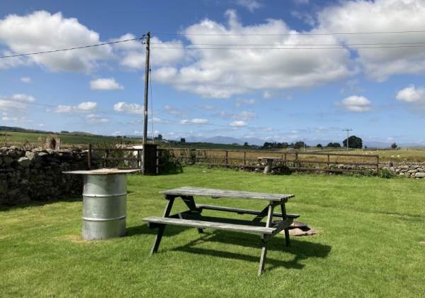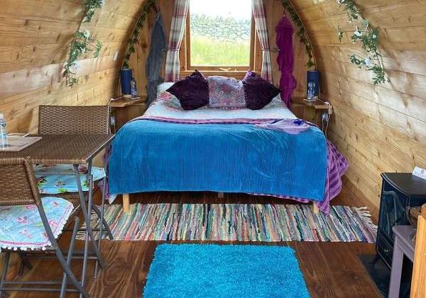 Outside, the pod is set in its own area. There is a private fire pit (logs, kindling and fire lighters are available for a small charge), picnic bench, BBQ stand (disposable BBQs available at small charge) and outdoor seating with shawls and blankets to sit out in the evening to enjoy the amazing sunsets over the mountains.