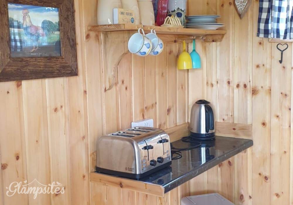 The Treehouse Shack is in an elevated position under an Oak tree, with views across open farmland. It is totally secluded and has its own separate Eco-toilet. Bedroom includes a cosy wood burner, small fridge, toaster and Kettle. Tea and Coffee is provided and an optional Breakfast in a basket service.