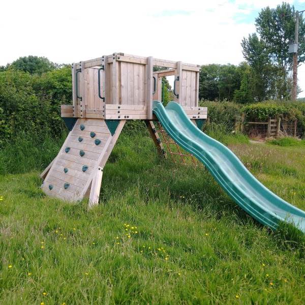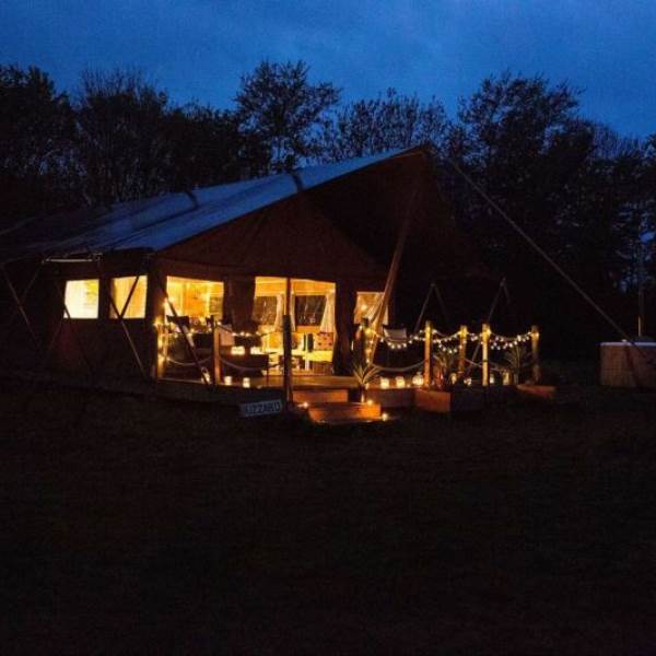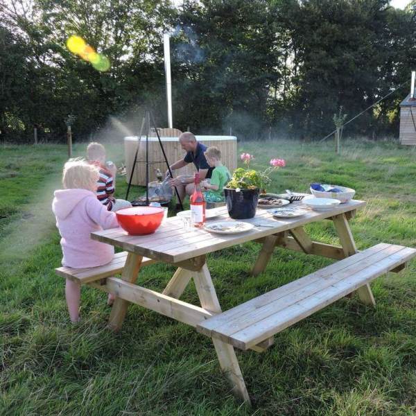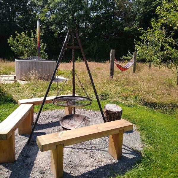 Outside the tent is a private wood fired hot tub (the hot tub is an OPTIONAL EXTRA bookable direct with owners), a hammock, firepit area and picnic table. This safari tent is a good choice for families with young children as you can see the play area from your deck or hammock.