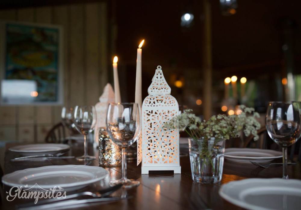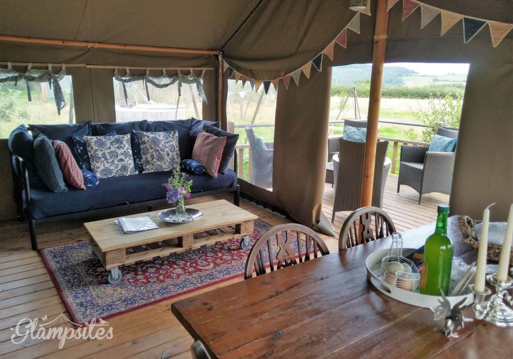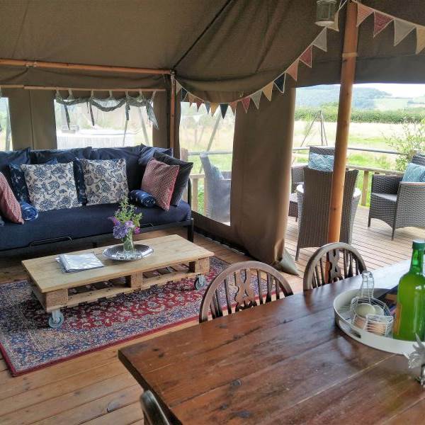 The tent kitchen is well equipped with lots of pans, crockery, cutlery and glasses etc. There's a mini fridge/freezer, up-cycled dresser, an induction hob if you want to heat something quickly without lighting the wood stove and there's a large farmhouse table and chairs. The sitting room has a large sofa and coffee table and there is more rattan seating on the front deck. Cooking and heating are via the large wood burning stove in the heart of the lodge and a generous amount of firewood is provided. The tent has LED lighting and a couple of sockets suitable for charging a phone or laptop. There's no WiFi but there's a good 4G signal on the farm if you need to stay connected.