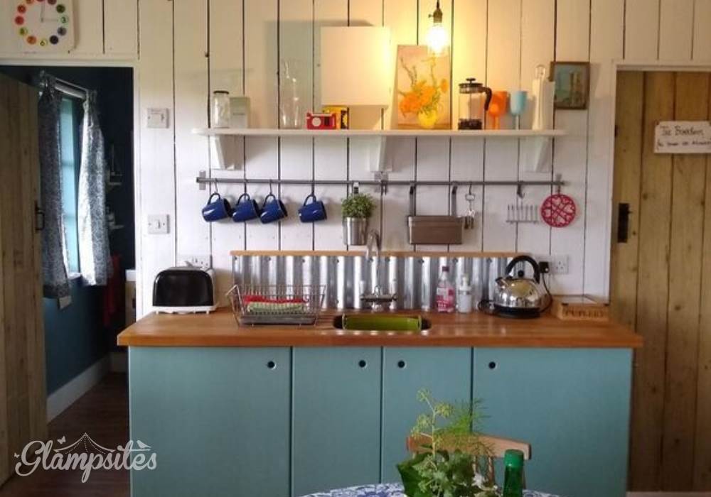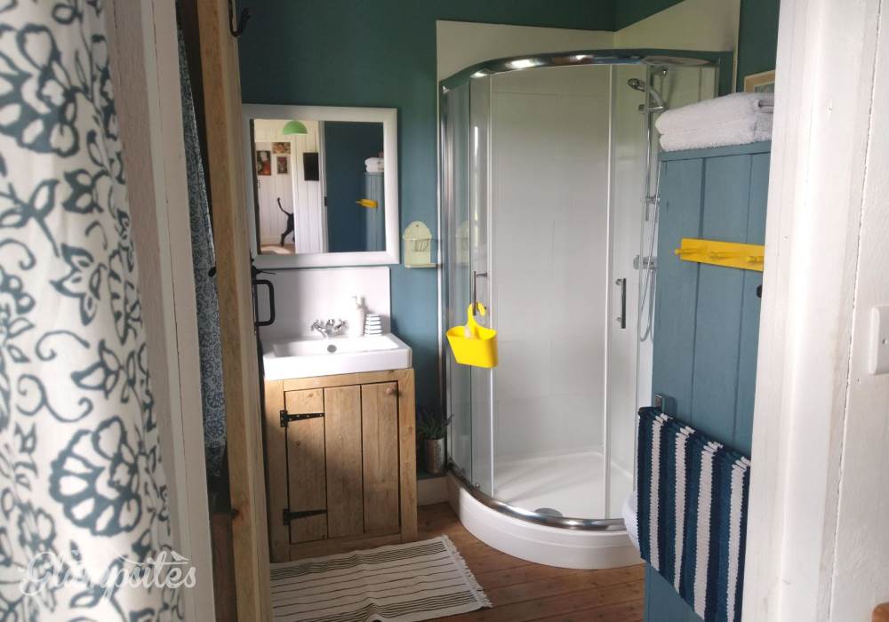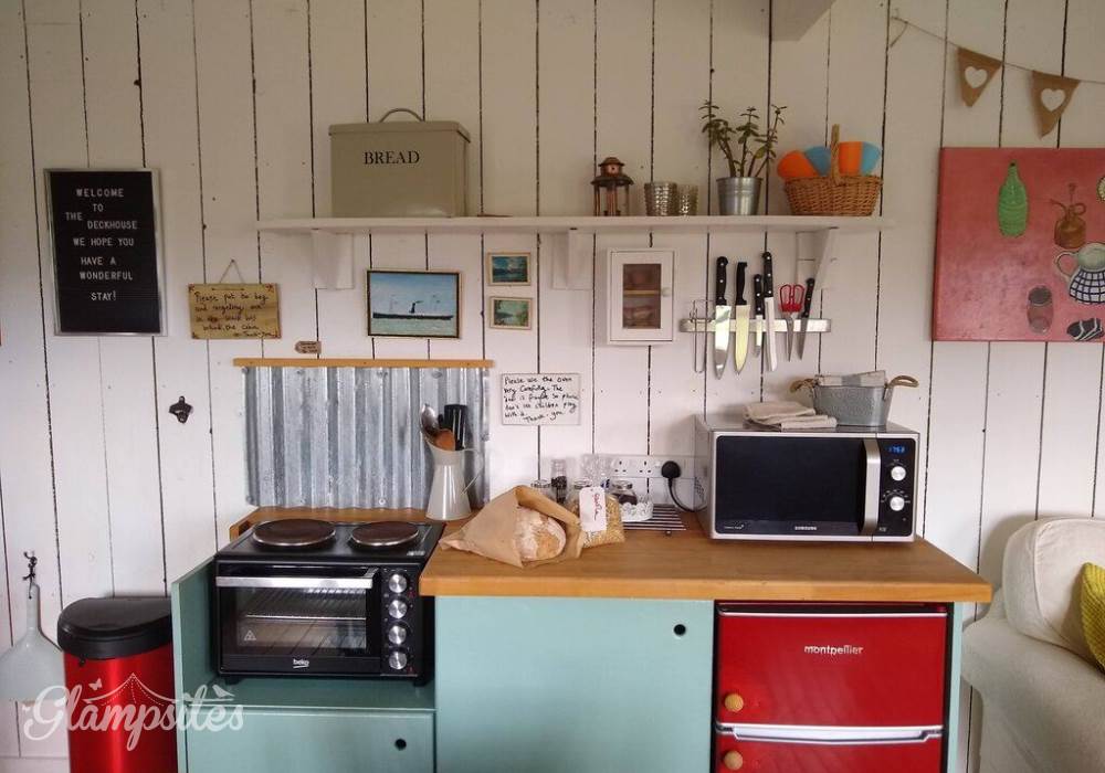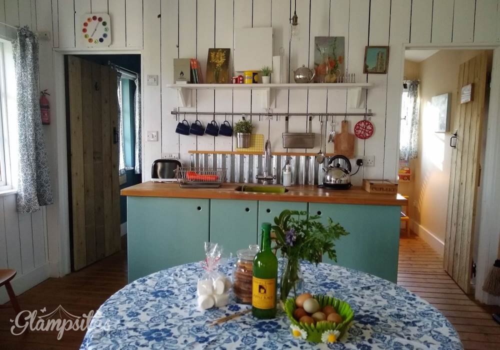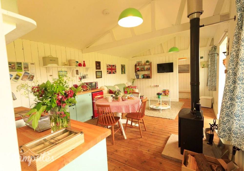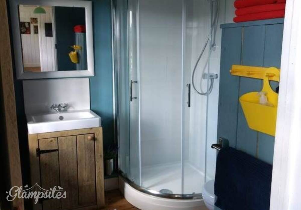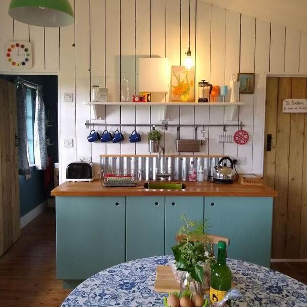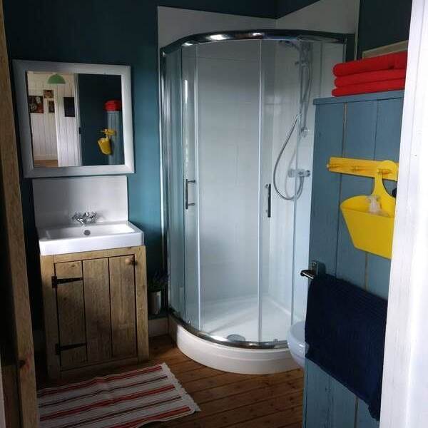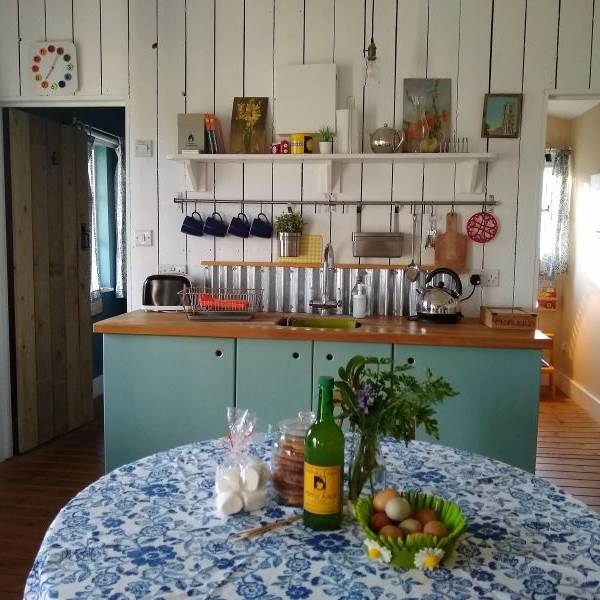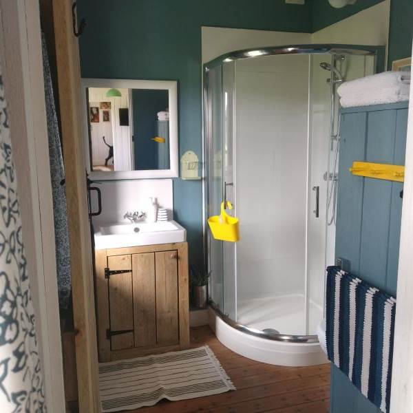 The cabin kitchen is cheerfully decorated and well equipped with mini-oven/hob, microwave, retro style under-counter fridge-freezer, and table with Ercol chairs. The open plan sitting room has a comfy sofa, wall mounted television, books & games, quirky original pictures and knick-knacks. The modern shower room runs off the open plan space and has towels, loo paper and soap etc provided. The cabin is heated by a wood fired stove which we will have pre-lit for you if you're staying in the winter. It's well insulated and perfectly warm all year round.
