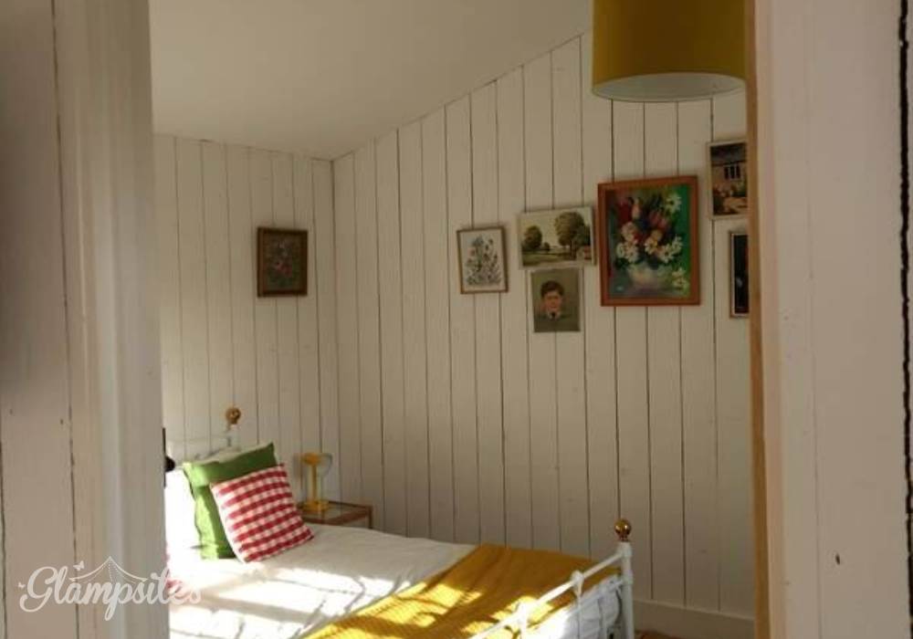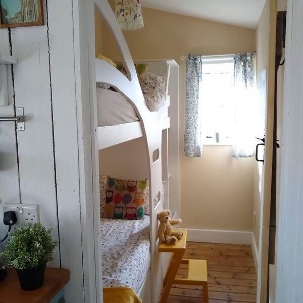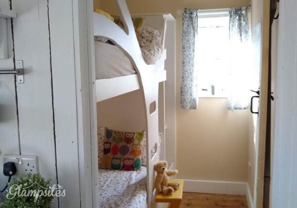 With views across open farmland The Deckhouse is a rustic timber cabin open all year round. Quirky and rustic, half self-catering cottage/ half glamping. It's on the other side of the farm from the safari tents so ideal if you are looking for a more private option. There's a king bed in the main bedroom and a mini bunk room at the other end of the cabin, the bunk room is small with narrow children's beds suitable for children under 12 years of age. Please note the bunk room isn't available with adult stays