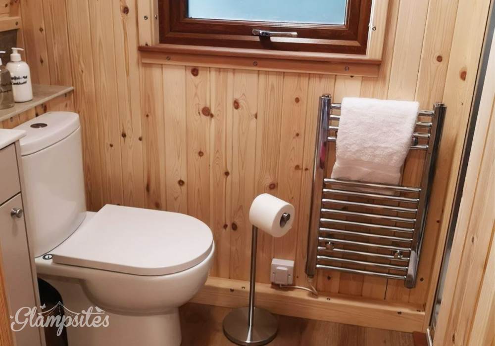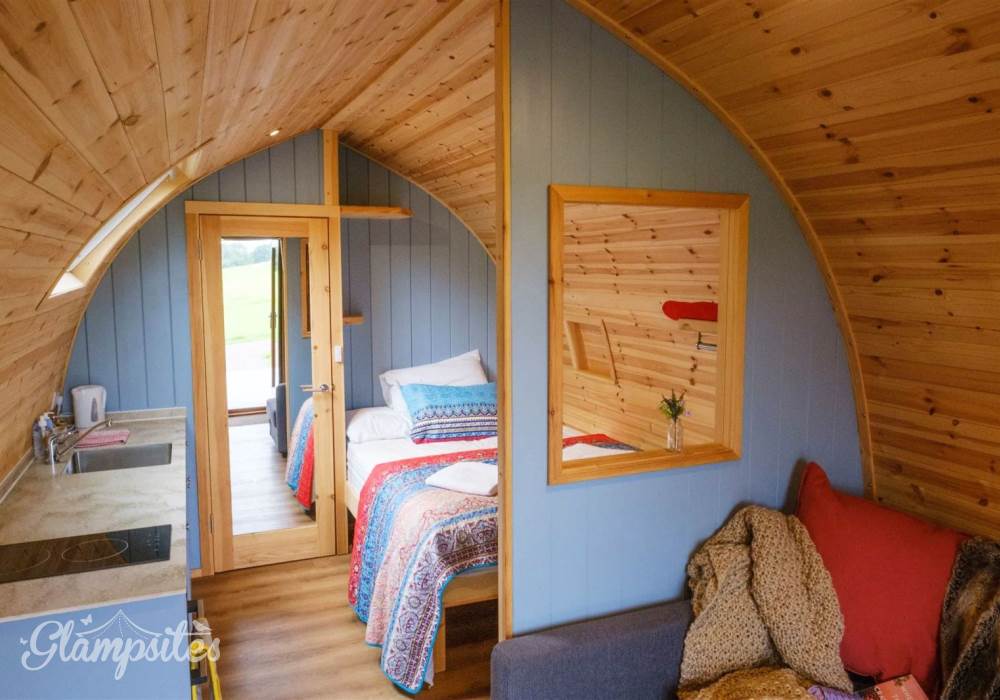 The kitchen area within the pod is fully equipped with a good-sized fridge featuring a freezer compartment, a 2-ring induction hob, and an oven, allowing guests to easily prepare their own meals. Basic cooking equipment, a kettle, cafetière, crockery, cutlery, and glassware are provided, along with complimentary tea, coffee, sugar, milk, and a delightful treat. Guests can also opt for a hamper of local food and brunch options to sample the region's flavours.