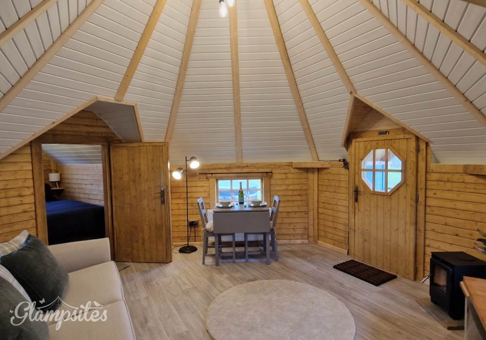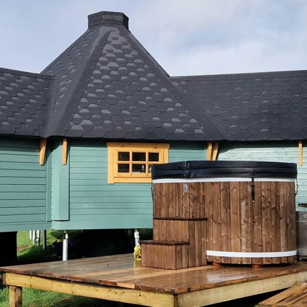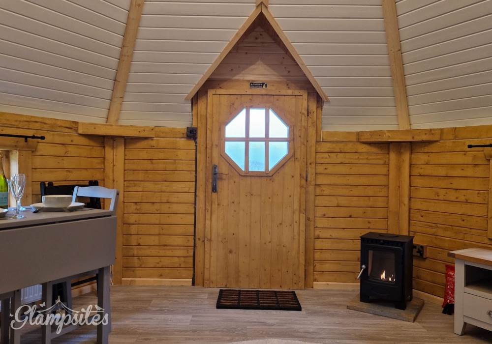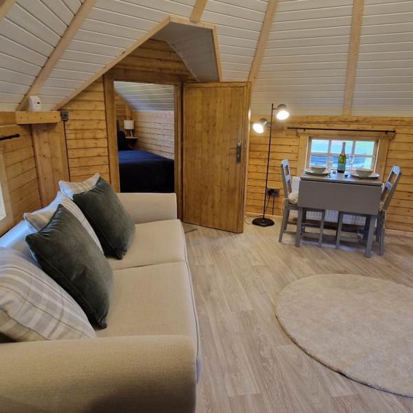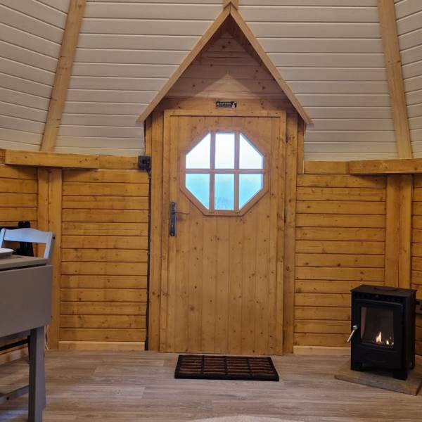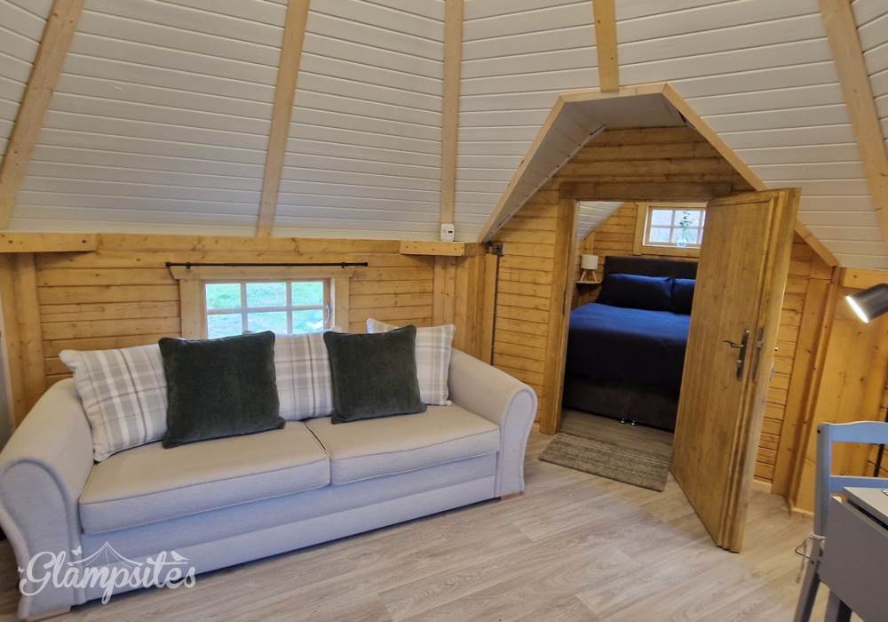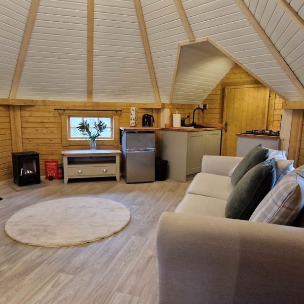 After a 3-4 minute, 300 metre walk from the car park (some up a hillside path), kick off your boots in the covered porch outside and head into your own quirky lodge.