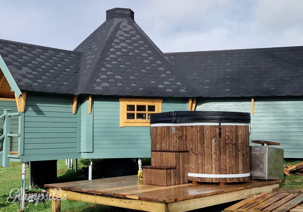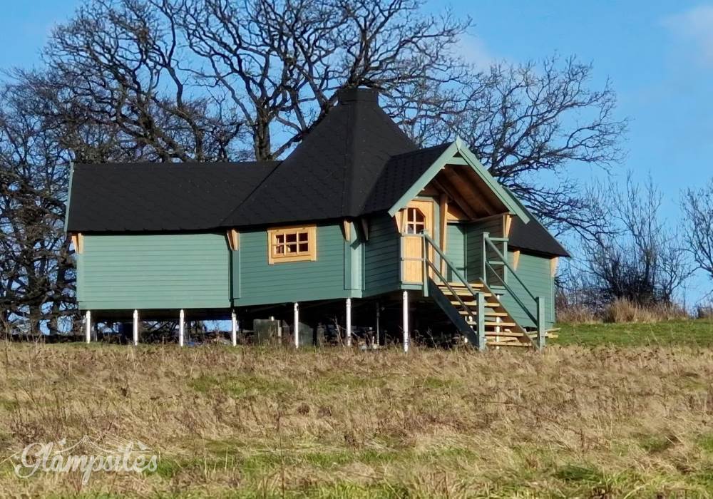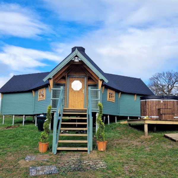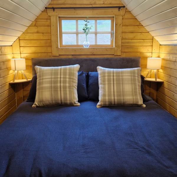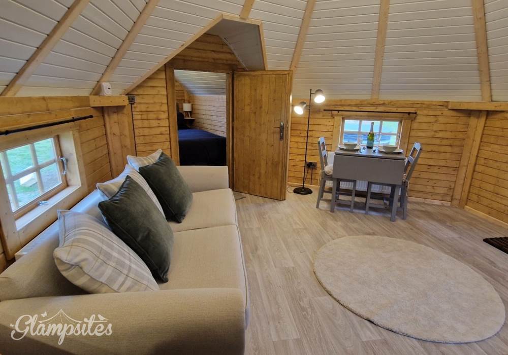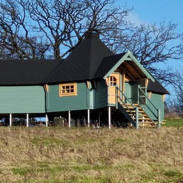 After a 3-4 minute, 300 metre walk from the car park (some up a hillside path), kick off your boots in the covered porch outside and head into your own quirky lodge.
