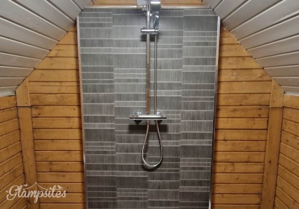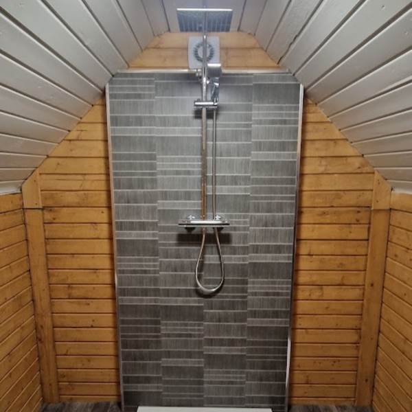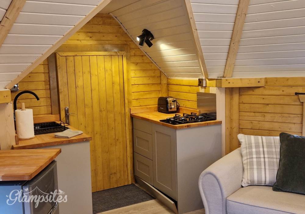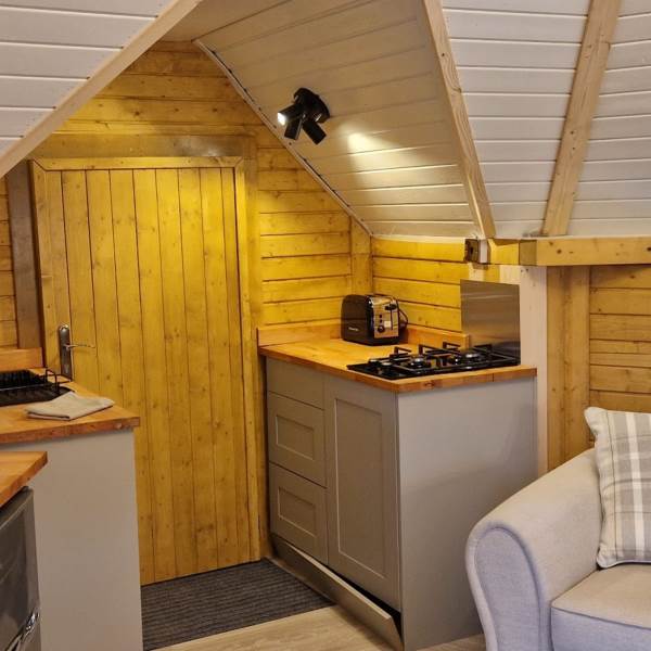 In the lodge there is one separate bedroom with a King Size bed, a shower room with toilet, sink, a kitchenette (mini kitchen) with microwave oven, air fryer, fridge/freezer and the spacious, quirky main room with a large sofa (converts to a 115cm wide bed for 1 older or 2 younger children) to unwind in. Cast Iron outdoor stove, in/outdoor tables and shower room.