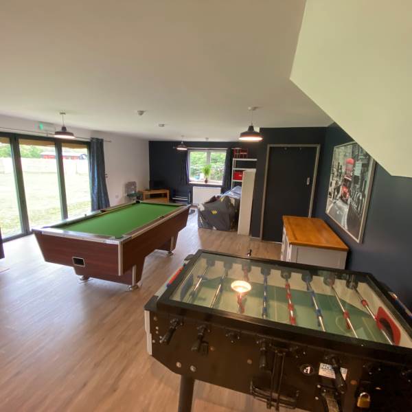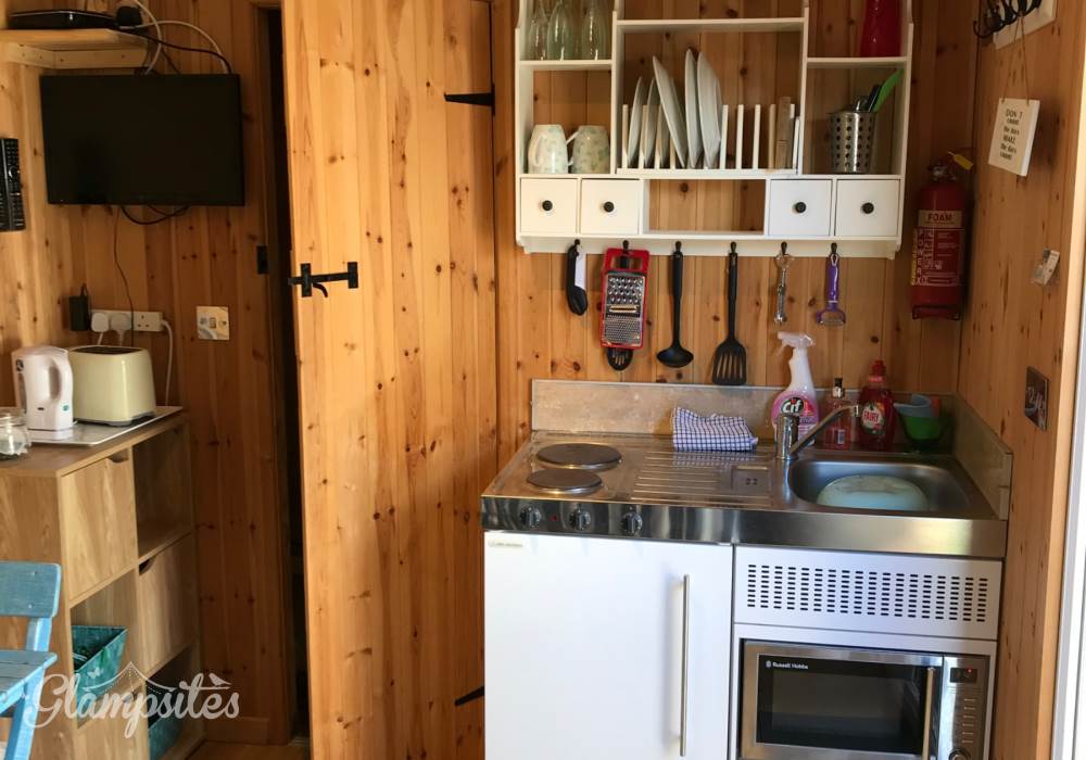 The kitchen is fully equipped with basin microwave kettle fridge and toaster, all pots pans crockery cutlery and cups including plastic for use in the hot tub.
