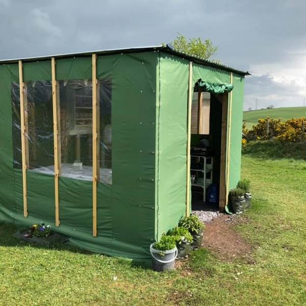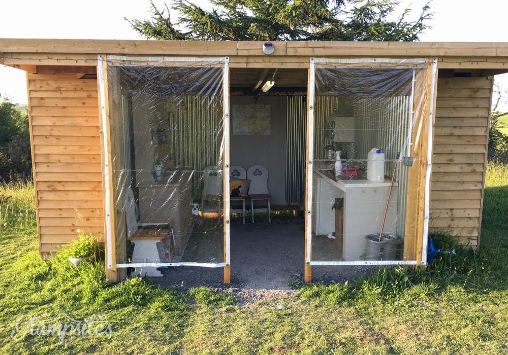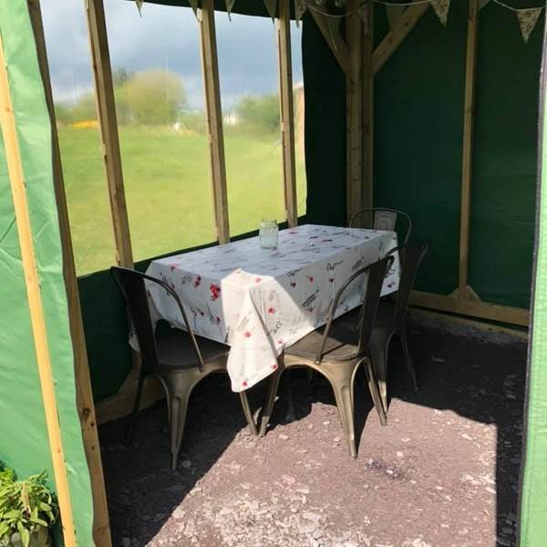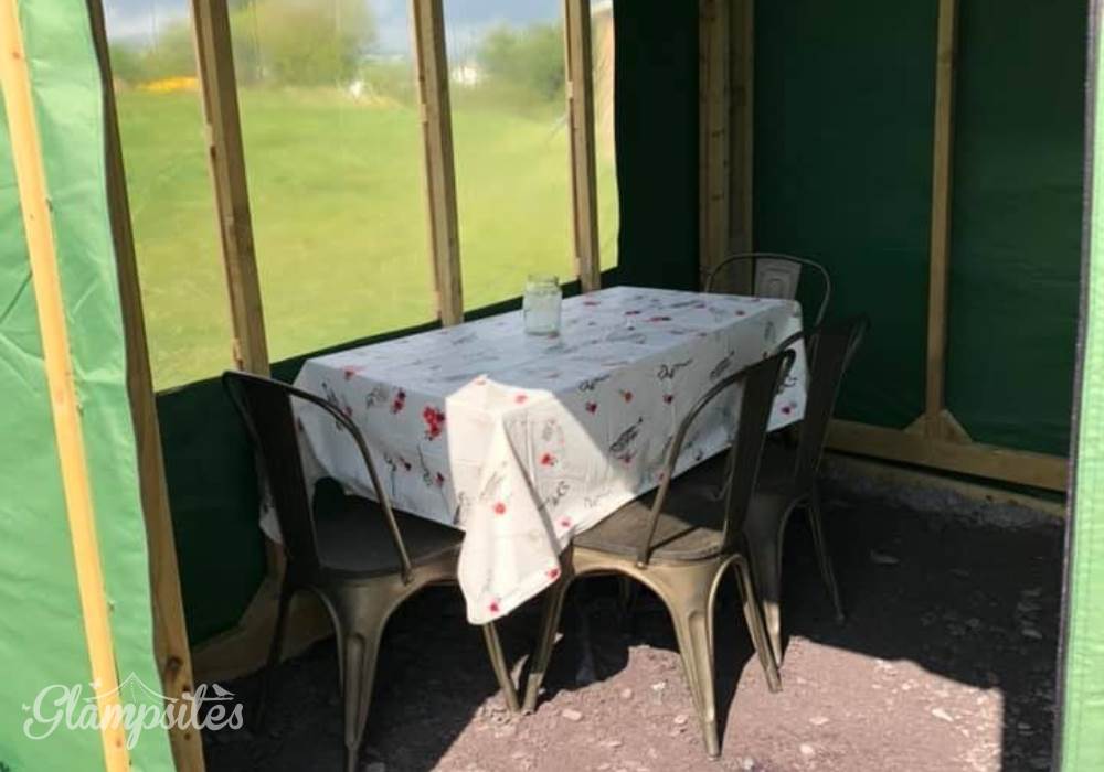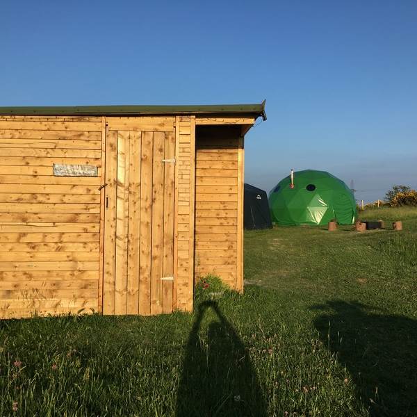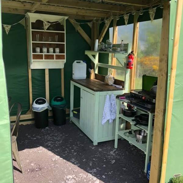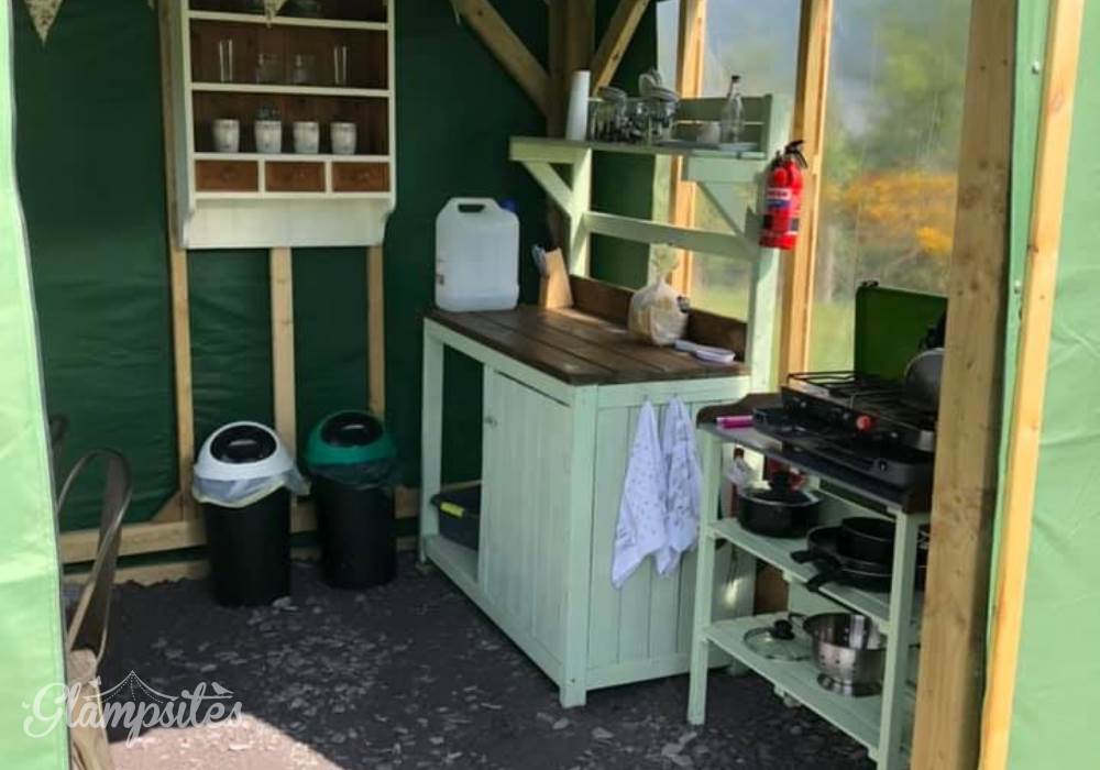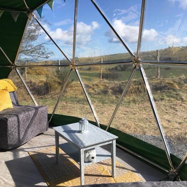 Each dome is furnished with a double bed, two single sofa beds, storage, lamps, warm blankets and a log burner. Ideal for chilly nights glamping in Wales. Outside you will find a toilet and a covered kitchen and dining area next to each dome. The kitchen is equipped with a camping stove, coolbox, utensils, saucepans, cutlery, crockery and some basics such as sugar, salt, teabags and coffee. You will find a fridge and freezer to use in the communal area along with washing up facilities and designated showers for each dome.