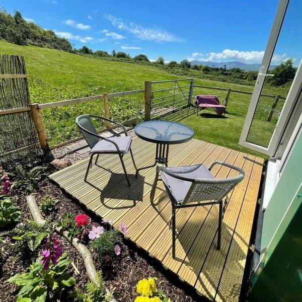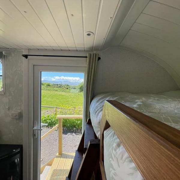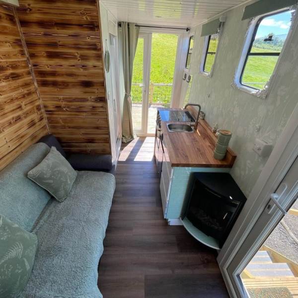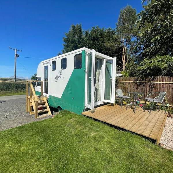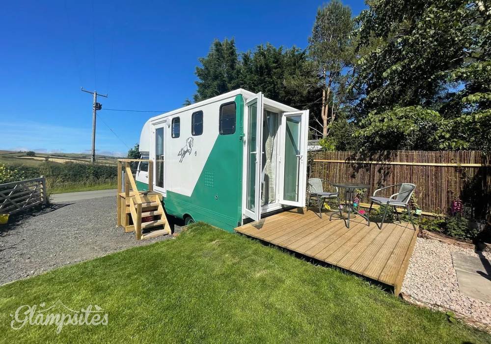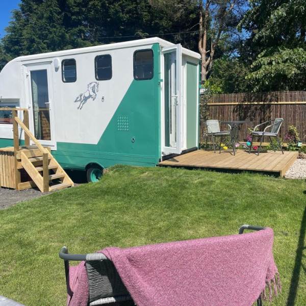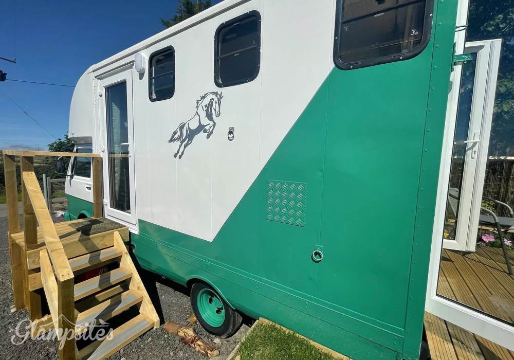 Fern is our lovingly converted 1994 Volkswagen horsebox away from our main glampsite. She has her own gated entrance with a parking area, garden and decking over looking the mountains.