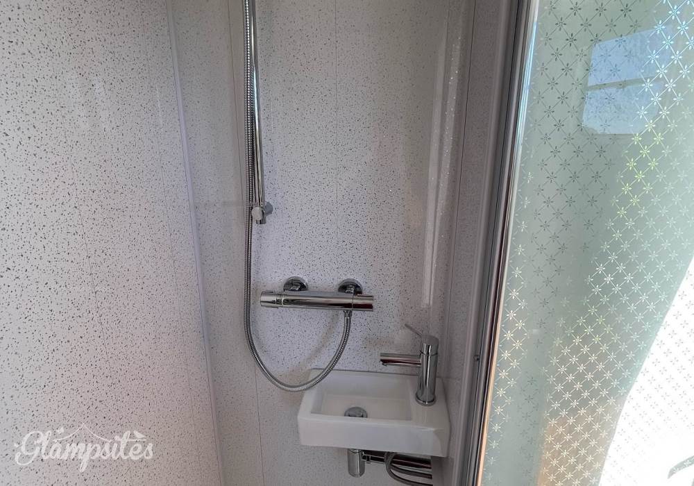 She has a lovely bathroom with a shower and toilet. USB sockets provided to charge phones and tablets next to the bedside.