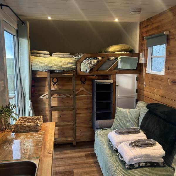 She sleeps 2 adults in a double bed (sorry no children) or if you need another bed, there is also a fold out small double sofa bed. She has a toilet, shower and kitchen with oven and fridge. Everything you need for a cosy getaway.