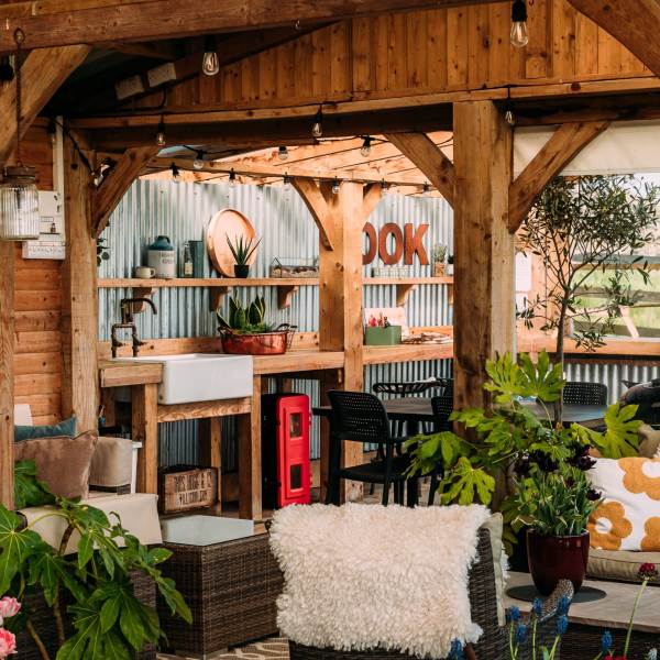 Peaks and Pods boasts 'The Hub' - a unique social space with a stunning Gozney pizza oven, large cast iron fire pit, Weber barbecue, sheltered cooking space, seating, lounge chairs, festoon lights, heating and wooden swing seat, perfect for all guests to enjoy.