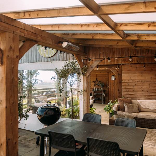 Peaks and Pods also boasts 'The Hub' - a unique social space with a stunning Gozney pizza oven, large cast iron fire pit, Weber barbecue, sheltered cooking space, seating, festoon lights and wooden swing seat, perfect for all guests to enjoy.