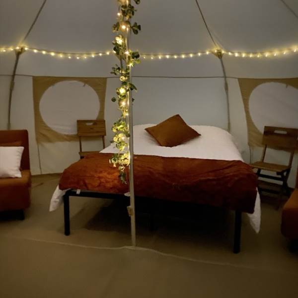 The Nova tent interior has been designed to give a relaxing atmosphere. Inside you will find a king bed, two single sofa beds, woven rugs, and solar-powered lighting.
