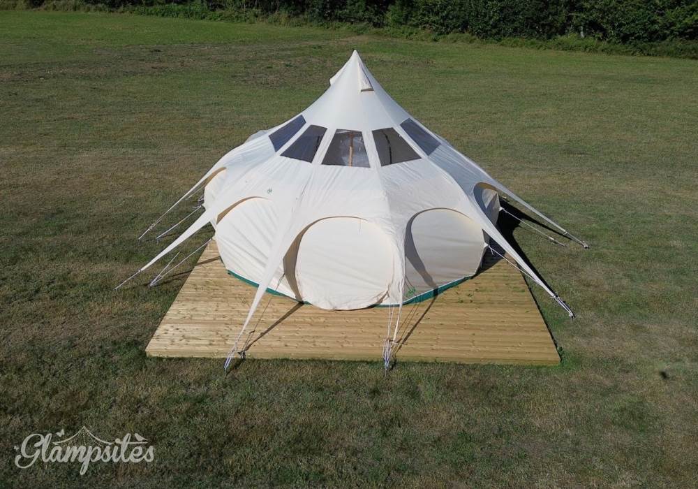 The Lotus Belle Star tent is a stunning combination of creative design, spacious interiors and luxury furnishings giving you boutique camping at its very best. It boasts all the usability of a standard bell tent but gives the roomy luxuriousness of a yurt. This 5m model has 18 square meters of standing space inside with 1.8m of headroom all the way to the edge.