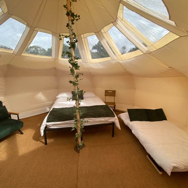 Set on a wooden platform raised off the ground, the Star tent has a beautiful blue interior colour scheme. Inside you will find a king bed, two single sofa beds, woven rugs, and solar-powered lighting.