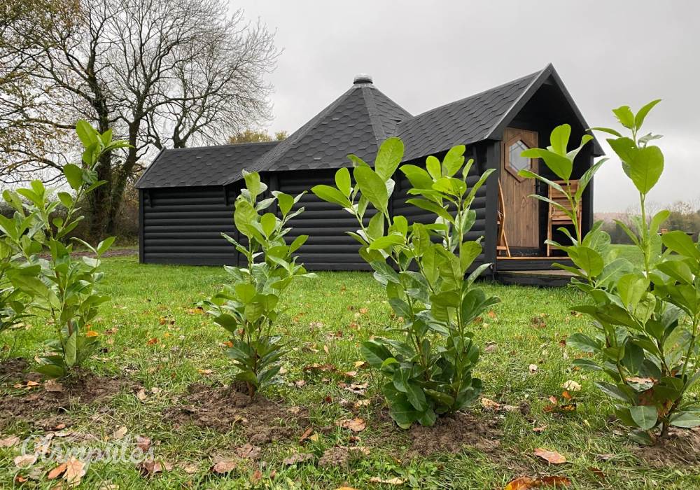 Outside, the cabin is surrounded by a charming wraparound gravel path, bordered by a neat low hedge that guides you to the front door and adds to the sense of privacy and care.
