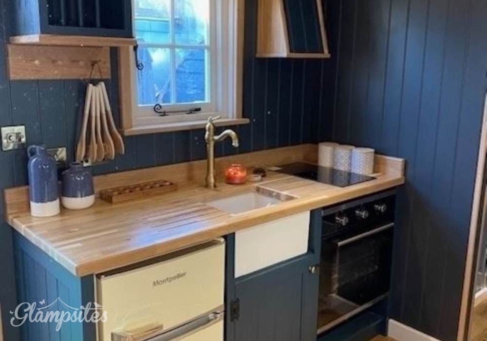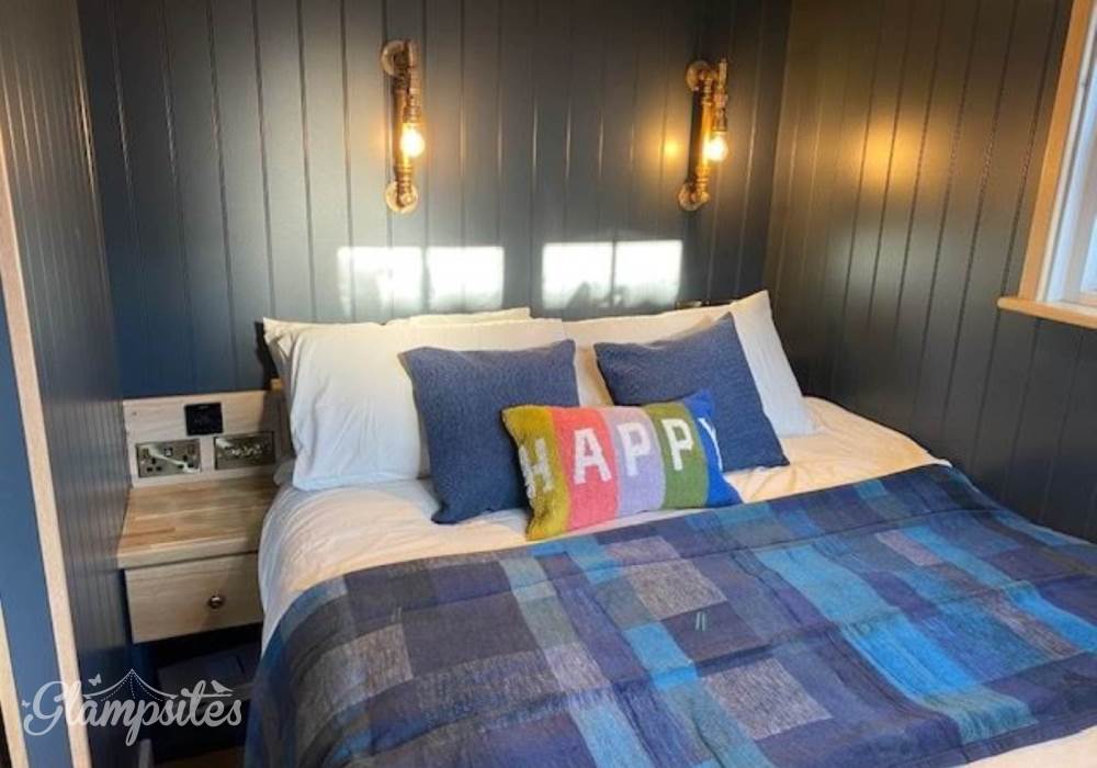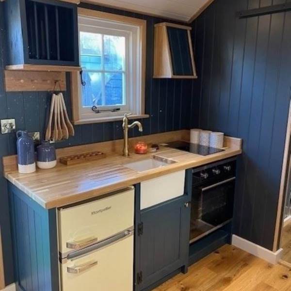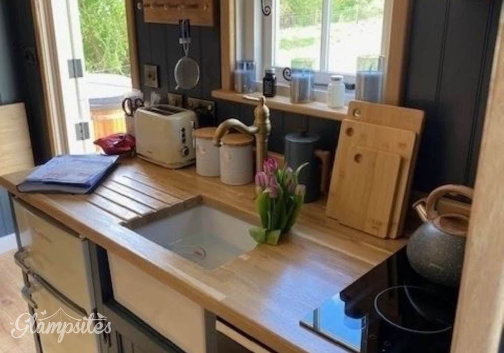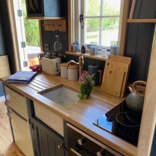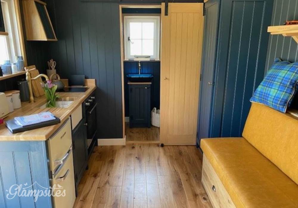 Stylish and well equipped, Shepherds Rest is furnished with a King size bed, side table, single pull leather sofa bed, hand made kitchenette with belfast sink, oak work top, breakfast bar, oven, two ring hob and fridge with small freezer compartment,, en-suite with shower, sink, flushing toilet and heated towel rail and underfloor heating! The outside area is equally well thought out with enclosed garden, picnic table and seating, sun loungers and meadow views. A fire pit with BBQ arm and paella pan is also provided.